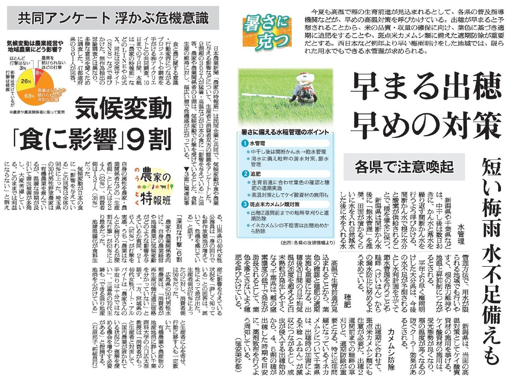 日本農業新聞は、国内唯一の日刊農業専門紙として、気候変動の農業への影響の実態や、対応に苦心する農業者の声を社会に広く発信しています。実践可能な適応策や緩和策を継続的に紹介し、農業者の課題解決に努めています。
