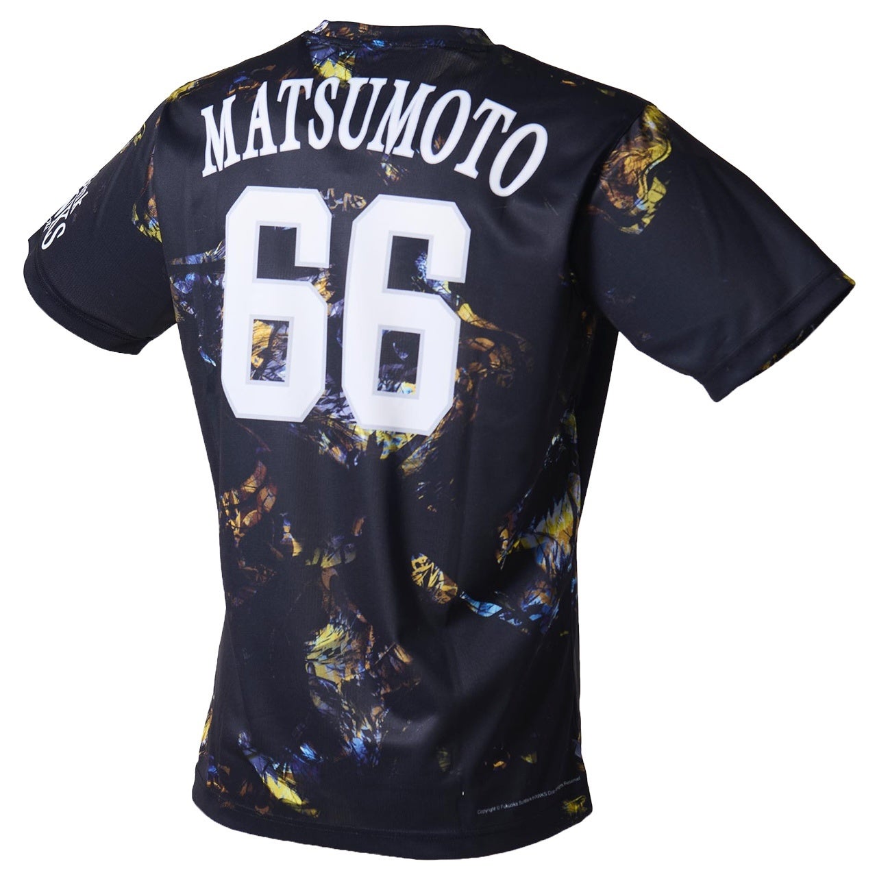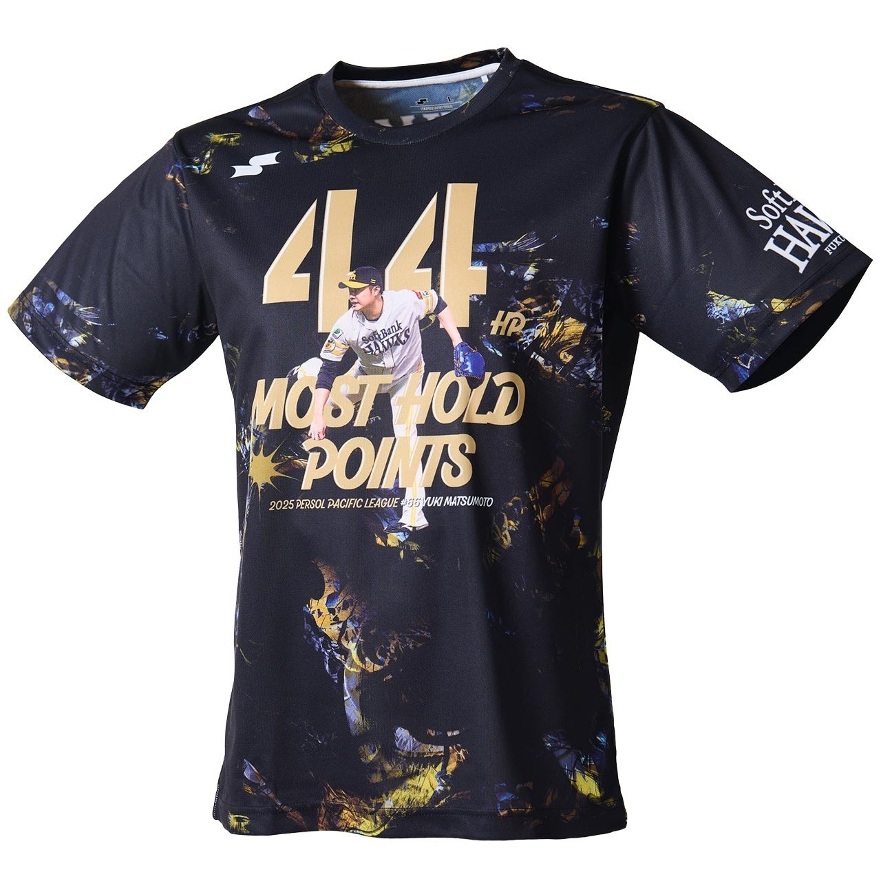 本記念Tシャツは、福岡ソフトバンクホークスをイメージした躍動する“鷹”をデザインし、胸元にはタイトル獲得を象徴する 「44 HP」 をゴールドで配置。その前面には、松本裕樹選手の力強い投球動作をレイアウト。中央には “MOST HOLD POINTS” のタイトルロゴ、そしてパリーグの名称と「#66 YUKI MATSUMOTO」を記載し、左袖には福岡ソフトバンクホークスのロゴが入り、タイトル獲得を球団と共に祝福。