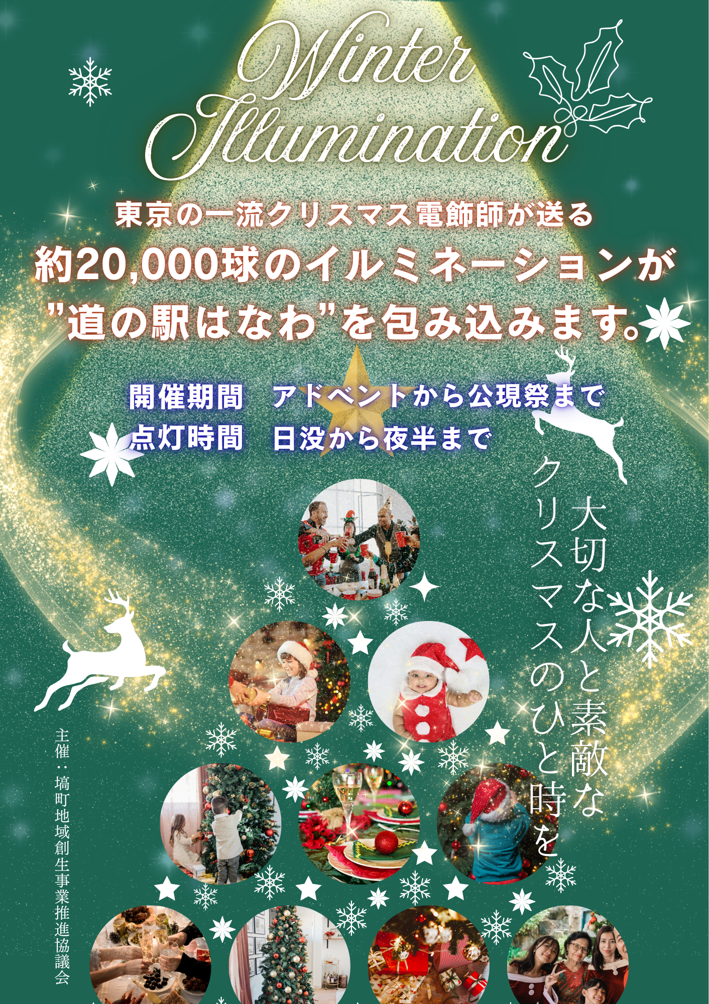 塙町地域創生事業推進協議会は、「道の駅はなわ」にて、クリスマス期間中にイルミネーションとイベントを実施することをお知らせいたします。