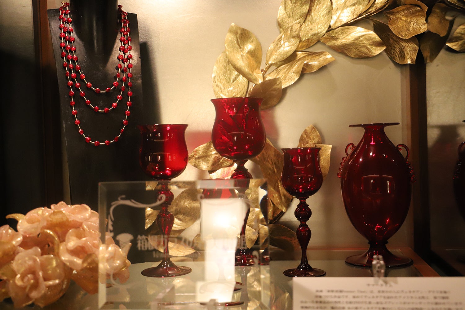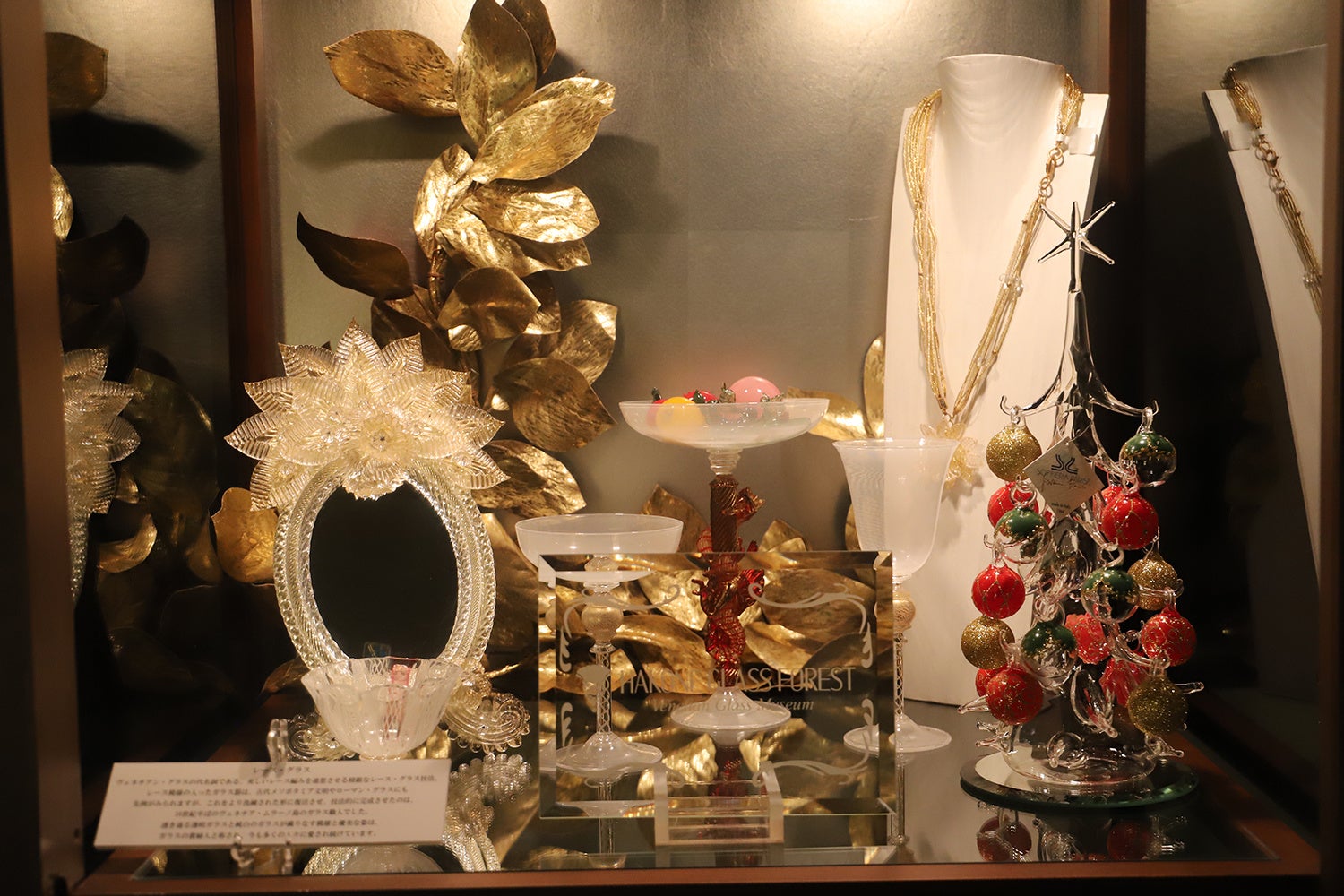店頭のショーケースには「レース・グラス」「ヴェネチアン・グラス」等を展示しており、飾られている商品の一部は箱根ガラスの森美術館ショップにてお求めいただけます。