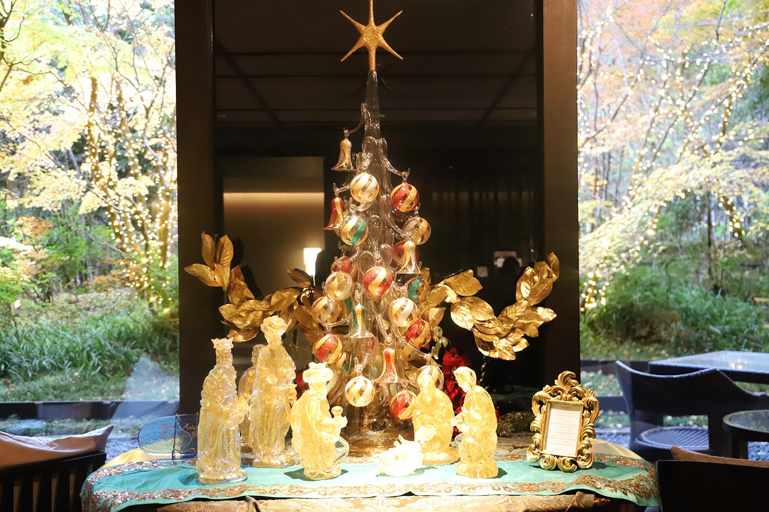 本コラボレーションでは、箱根ガラスの森美術館が所蔵するヴェネチアン・グラス作品やガラス製ツリーオブジェに加え冬を象徴するガラスの“プレゼピオ”を「天悠 The Bar & Lounge」で展示しています。“プレゼピオ”は中世ヨーロッパではクリスマスツリーと並ぶ重要な飾りとして、季節の厳かな空気を象徴する存在です。紙や木、陶器など多様な素材で作られてきましたが、19世紀頃より、ムラーノ島ではガラスによる聖人形が制作され、その伝統美が今日まで受け継がれています。クリスマスの時期には、小さなガラス人形が温かな物語を感じさせるシーンを演出し、展示空間に趣を添えます。