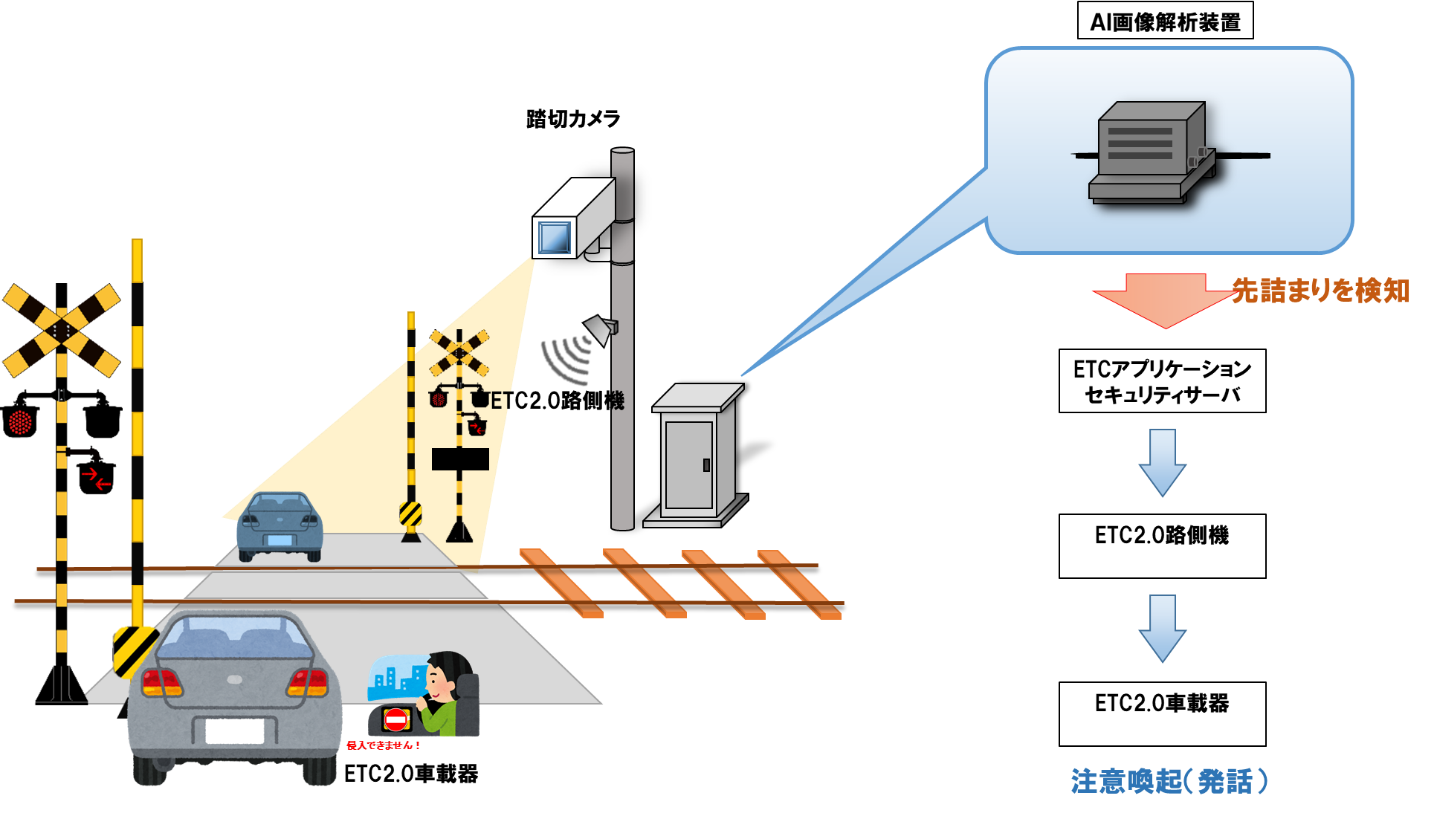 本実験は、前方道路の混雑時に踏切に進入する一般車両に対してETC2.0車載器からの音声による注意喚起を行うことで、不注意による踏切内の自動車の停滞を抑止し、接触事故の発生防止につなげ、踏切の安全性向上を目指します。