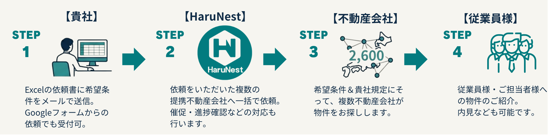 お部屋探しは、HaruNestが全国2,600店舗の提携不動産会社へ一括依頼し、条件と社宅規定に合った物件を複数提案します。