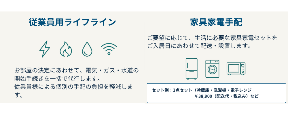 企業に雇用される外国人社員の住居・ライフライン・家具家電をサポートするワンストップサービスです。