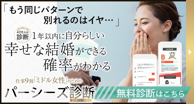 パーシーズ診断は、結婚したいけど婚活が長期化している、同じパターンで別れを付き合っても結婚まで進まない理由を「超精密」に診断することができる、恋愛・結婚のパーソナルトレーニング「parcy's」(パーシーズ)のオリジナル診断テストです。企業で用いられる適性検査レベルの高精度分析アルゴリズムによってあなたの結婚を掴む力を「超精密」に診断することができます。
