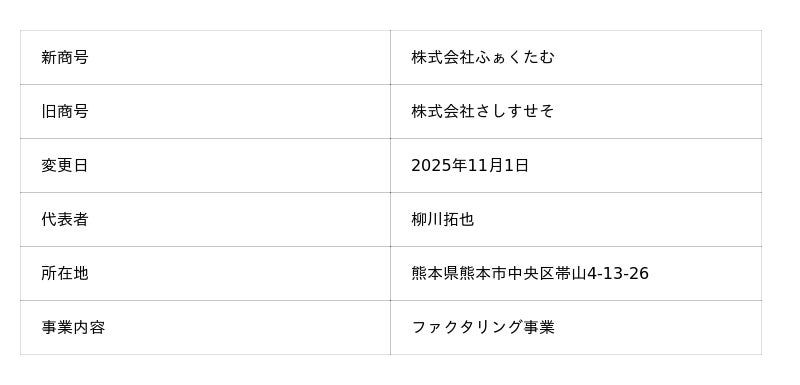 株式会社さしすせそ(本社:熊本県熊本市、代表取締役社長:柳川拓也)は、2025年11月1日付で「株式会社 ふぁくたむ」へ社名を変更したことお知らせいたします。