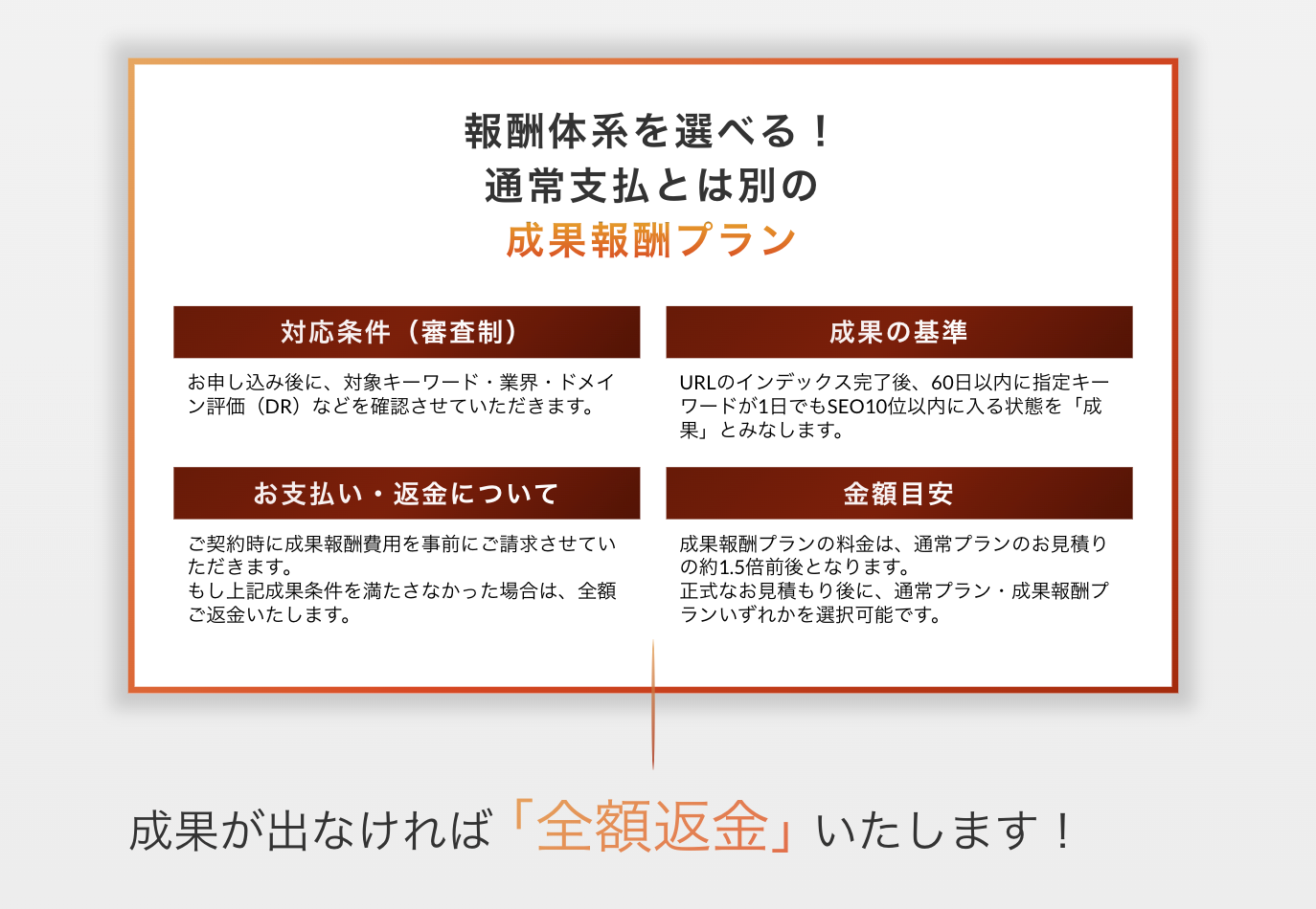 - 成果が出なければ「全額返金」の成果報酬プランを用意:通常支払プランに加え、成果報酬プランを提供。もし指定キーワードがSEO10位以内に入らなかった場合は、事前に請求した成果報酬費用を全額返金いたします。