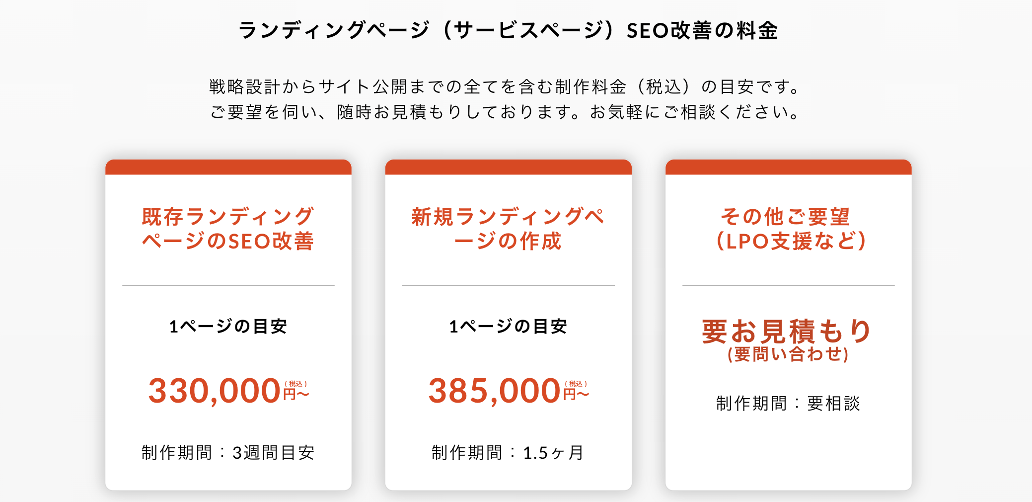 - 100サイト以上の実績で証明された“再現性の高いLP特化のSEO対策:これまでに100社以上のランディングページ改善を支援し、売上直結キーワードで上位表示を多数達成。SEO順位の改善だけでなく、CVR向上も再現してきました。- SEOとLP制作の両方に精通した専門メンバーが担当:SEOコンサルタントとデザイナーが別々に動くのではなく、SEOもデザインも開発もわかる担当がアサインされます。構造化マークアップまで最適化し、検索エンジンに理解されるサイトを構築します。