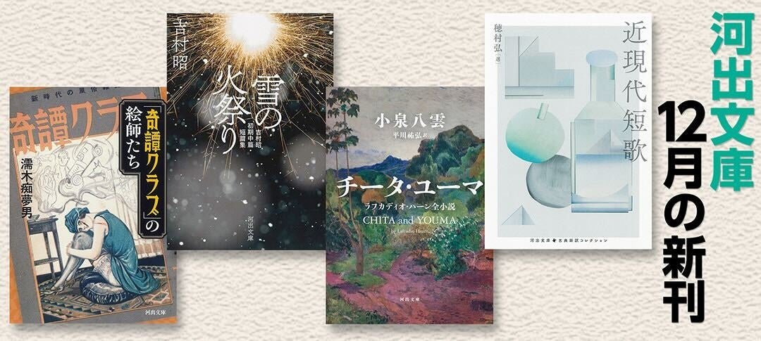 【河出文庫12月の新刊】穂村弘選『近現代短歌』、小泉八雲著/平川祐弘訳『チータ・ユーマ』、吉村昭初期中篇・短篇集『雪の火祭り』、伝説の雑誌の裏面史『「奇譚クラブ」の絵師たち』、4点を発売!