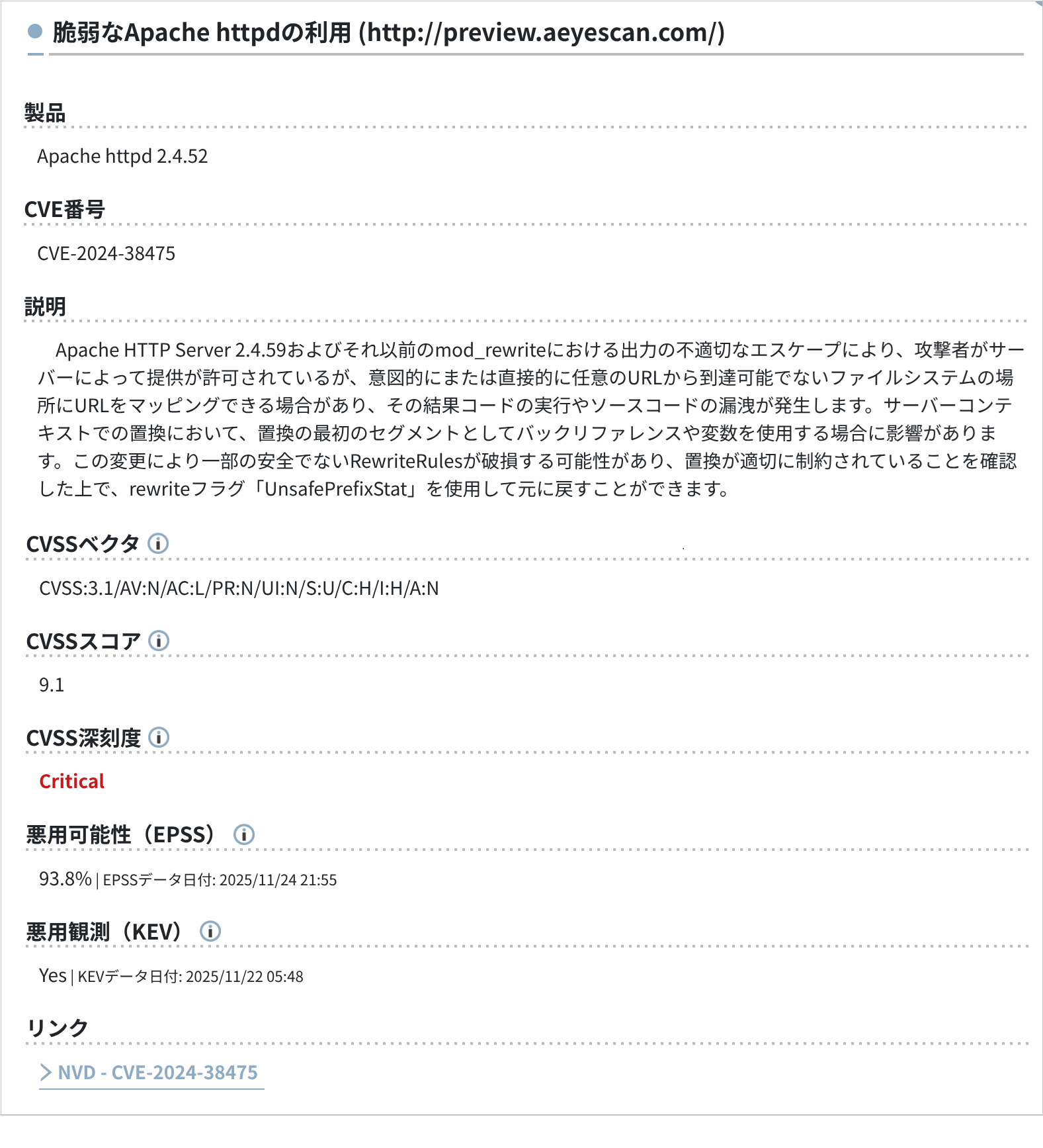 - 生成AIによるリスク情報の自動解説脆弱性の公開情報をもとに、生成AIがリスクの深刻度を日本語でわかりやすく解説します。