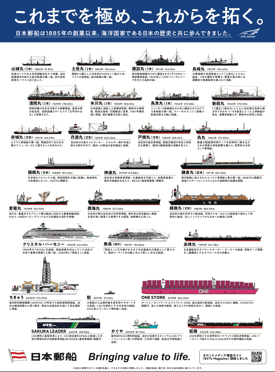本広告は、日本郵船の歴史を象徴する27隻の主要な船舶を、史実資料をもとに描き下ろしたイラストで構成。それぞれの船に添えたテキストには、造船当時の時代背景や企業の歩み・想いを込め、視覚的にもストーリーを感じられる表現としました。