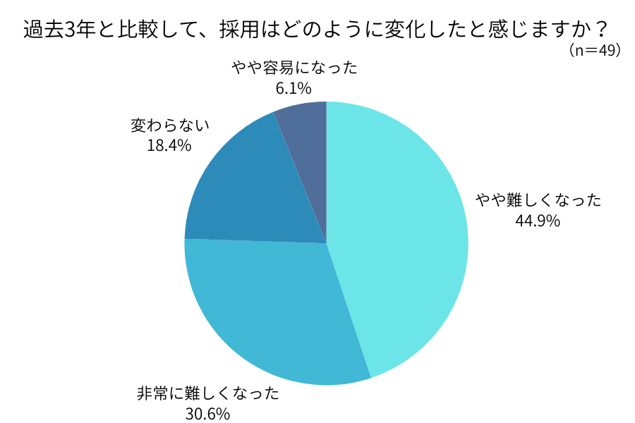 さらに、過去3年間との比較では、「非常に難しくなった」が30.6%、「やや難しくなった」が44.9%と、75.5%が採用難の深刻化を実感しています。一方で「やや容易になった」はわずか6.1%にとどまり、採用環境の厳しさが年々増していることが浮き彫りになりました。