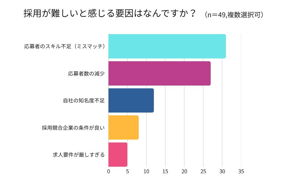 採用が難しいと感じる要因について複数回答で尋ねたところ、最も多かったのは「応募者のスキル不足(ミスマッチ)」で63.3%でした。次いで「応募者数の減少」が55.1%と、量と質の両面で課題を抱えている実態が明らかになりました。
