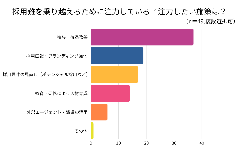 次いで「採用広報・ブランディング強化」が38.8%、「採用要件の見直し(ポテンシャル採用など)」が34.7%と続きました。待遇改善だけでなく、企業の魅力発信や柔軟な採用基準の設定など、多角的なアプローチの必要性が認識されていることがうかがえます。