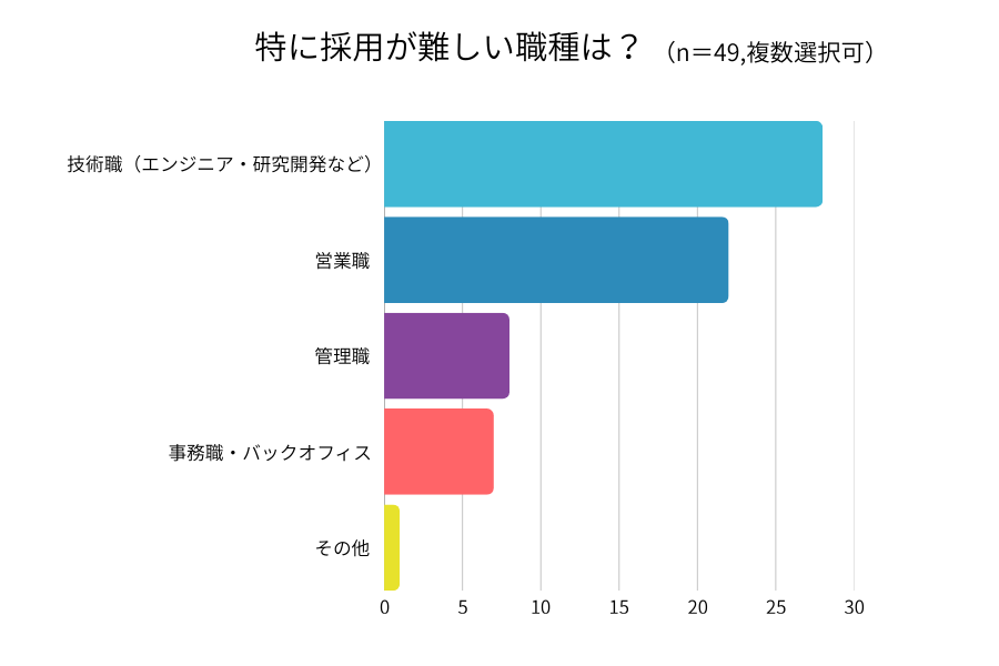 特に採用が難しい職種について尋ねたところ、「技術職(エンジニア・研究開発など)」が57.1%で最多となりました。DX推進やIT人材不足が叫ばれる中、専門スキルを持つ技術者の獲得競争が激化している状況が反映されています。