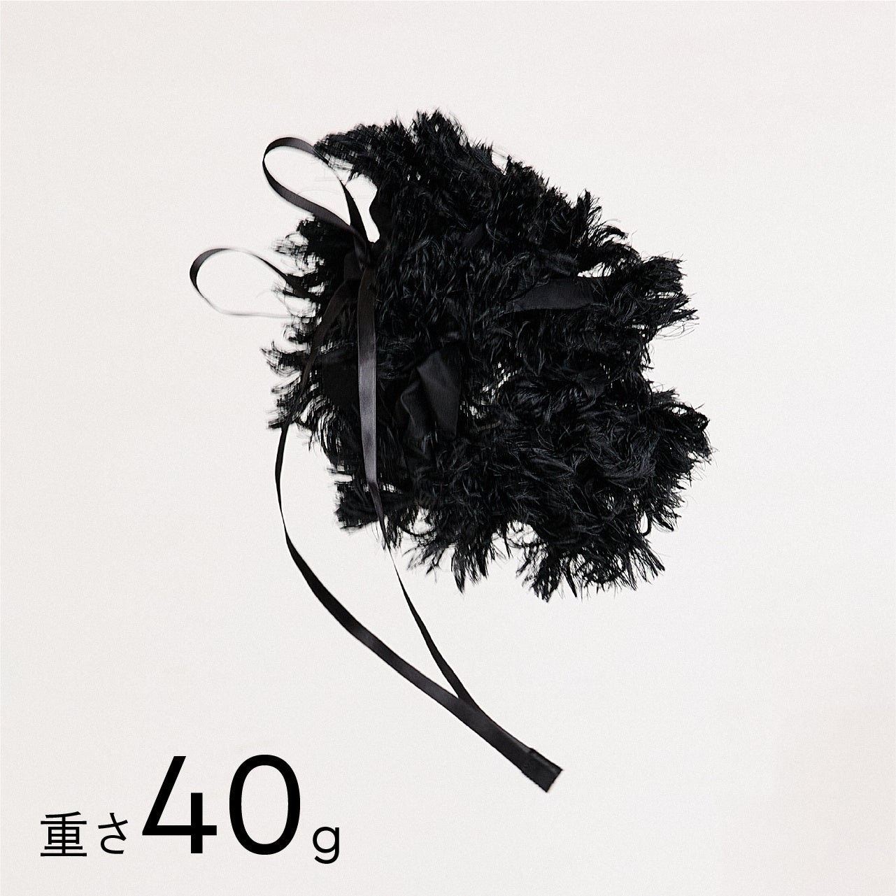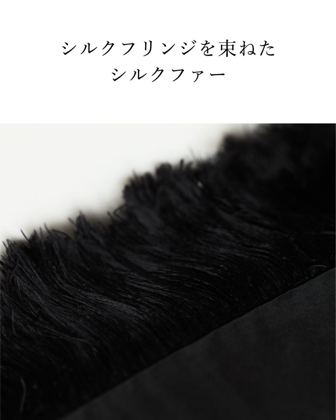 シルクタフタで使用される細い緯糸をフリンジにしてまるでファーのように仕立てました。フリンジ加工でも、縫製でも繊細さが求められます。
