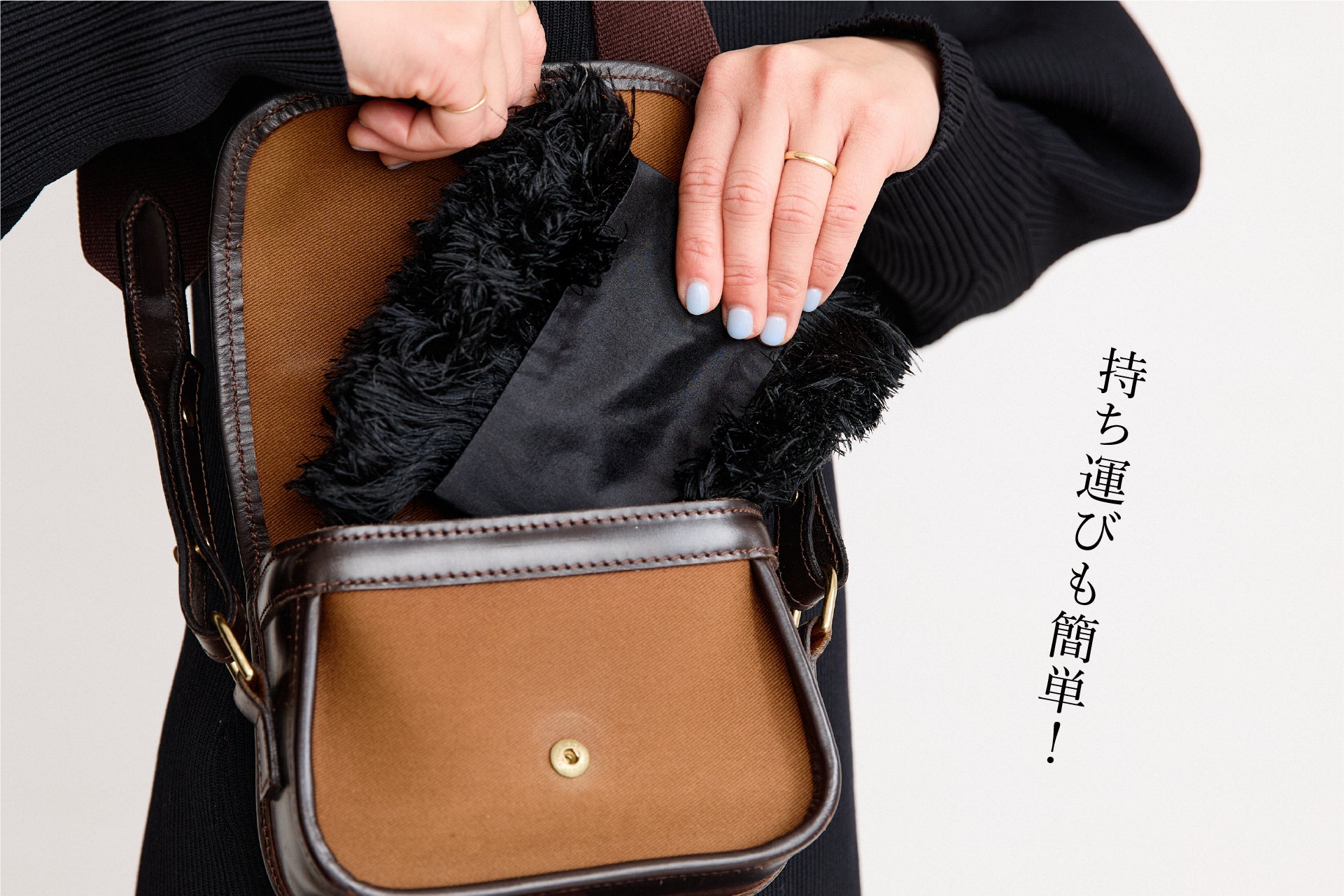 小さく畳めば手のひらほどのコンパクトサイズになるため、小さなバッグにも収めることができます。これ一つバッグに忍ばせておけば、いつでも、どこでも、いつもの洋服がドレスアップします。