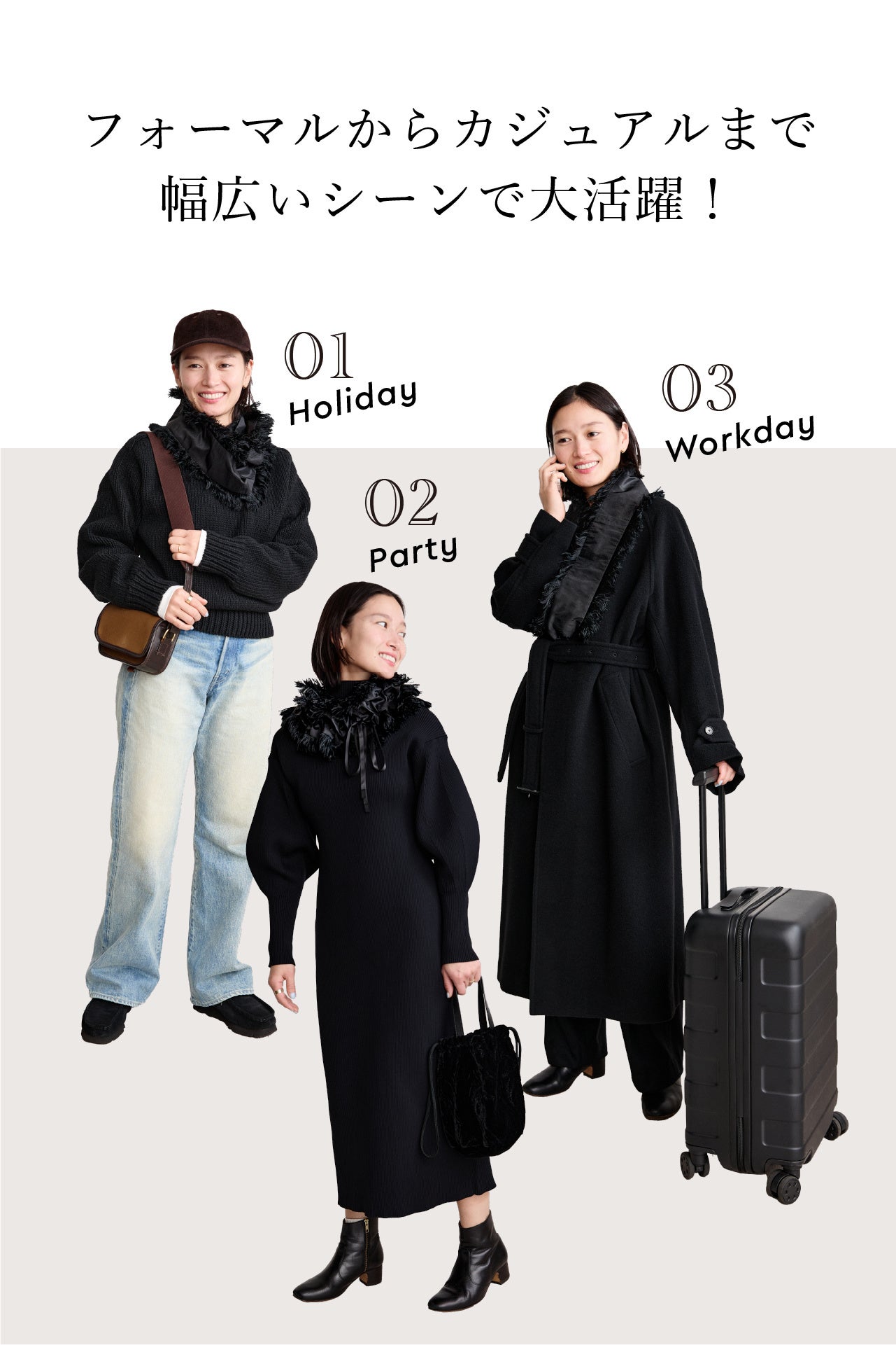 使い方は首元だけではなく、ギャザーを寄せてウエストマークをつくったり、肩にかけてボレロのような着こなしもできます。さらに、シルクファーの着こなし上級者であれば、帽子のようにも着用することができます。