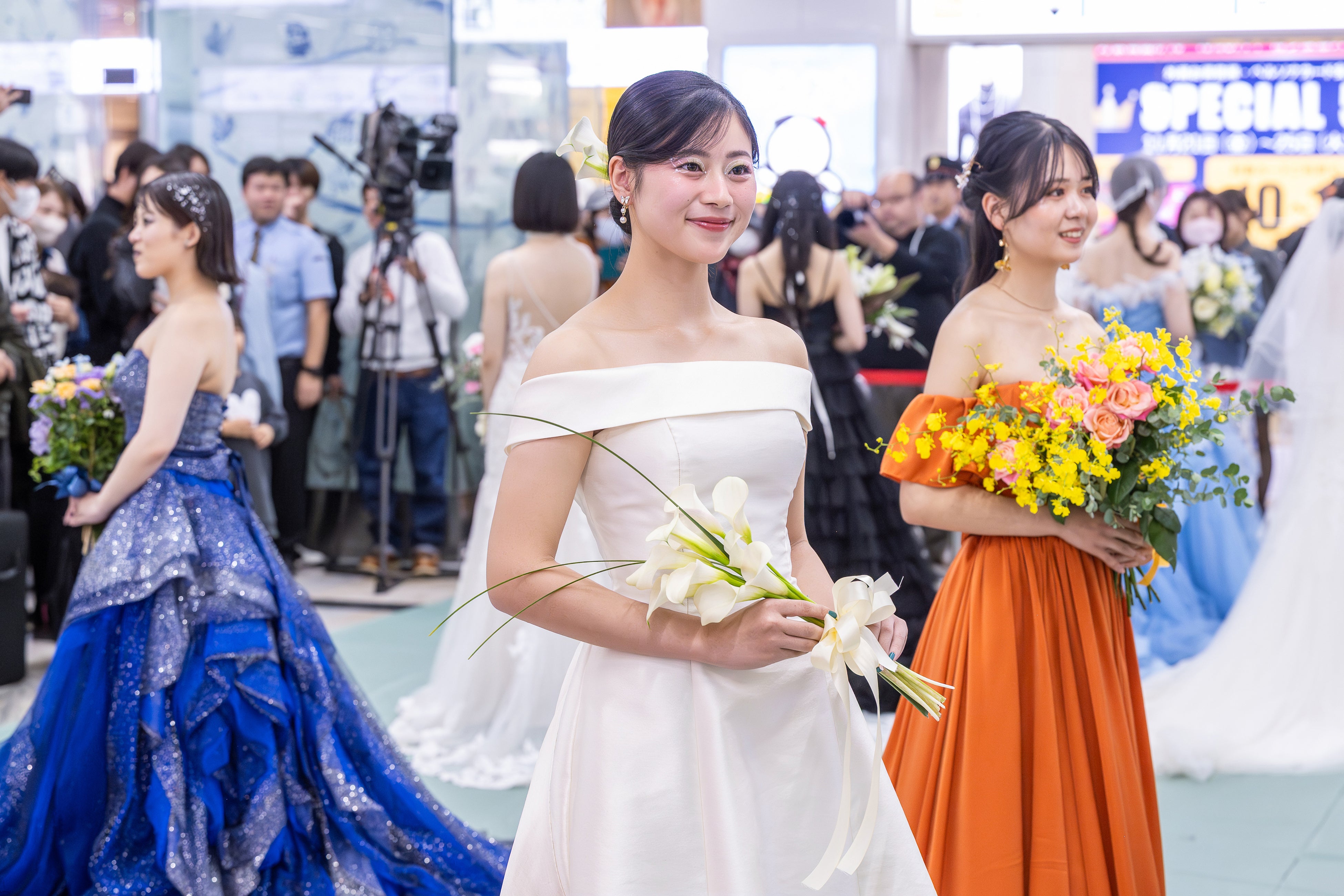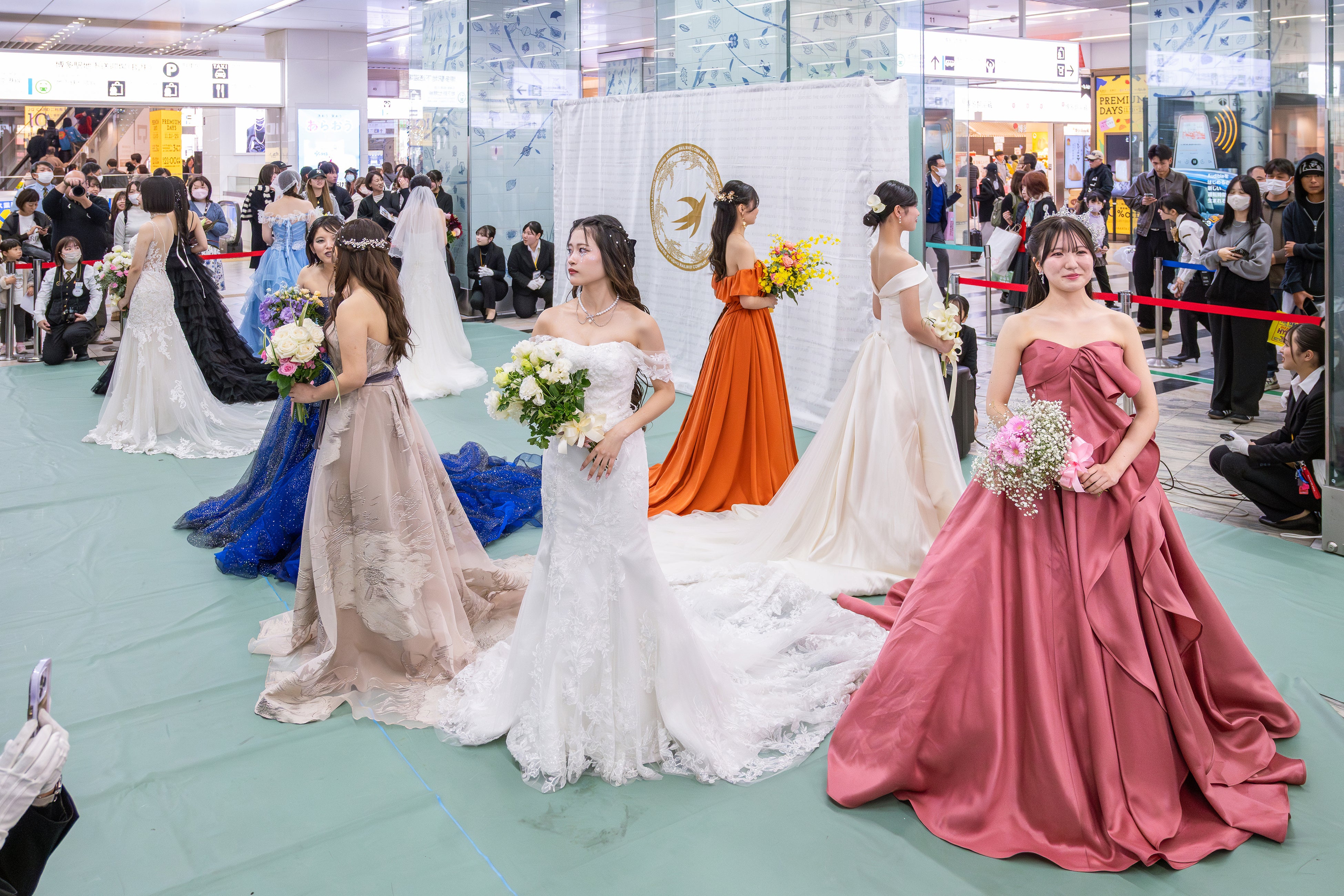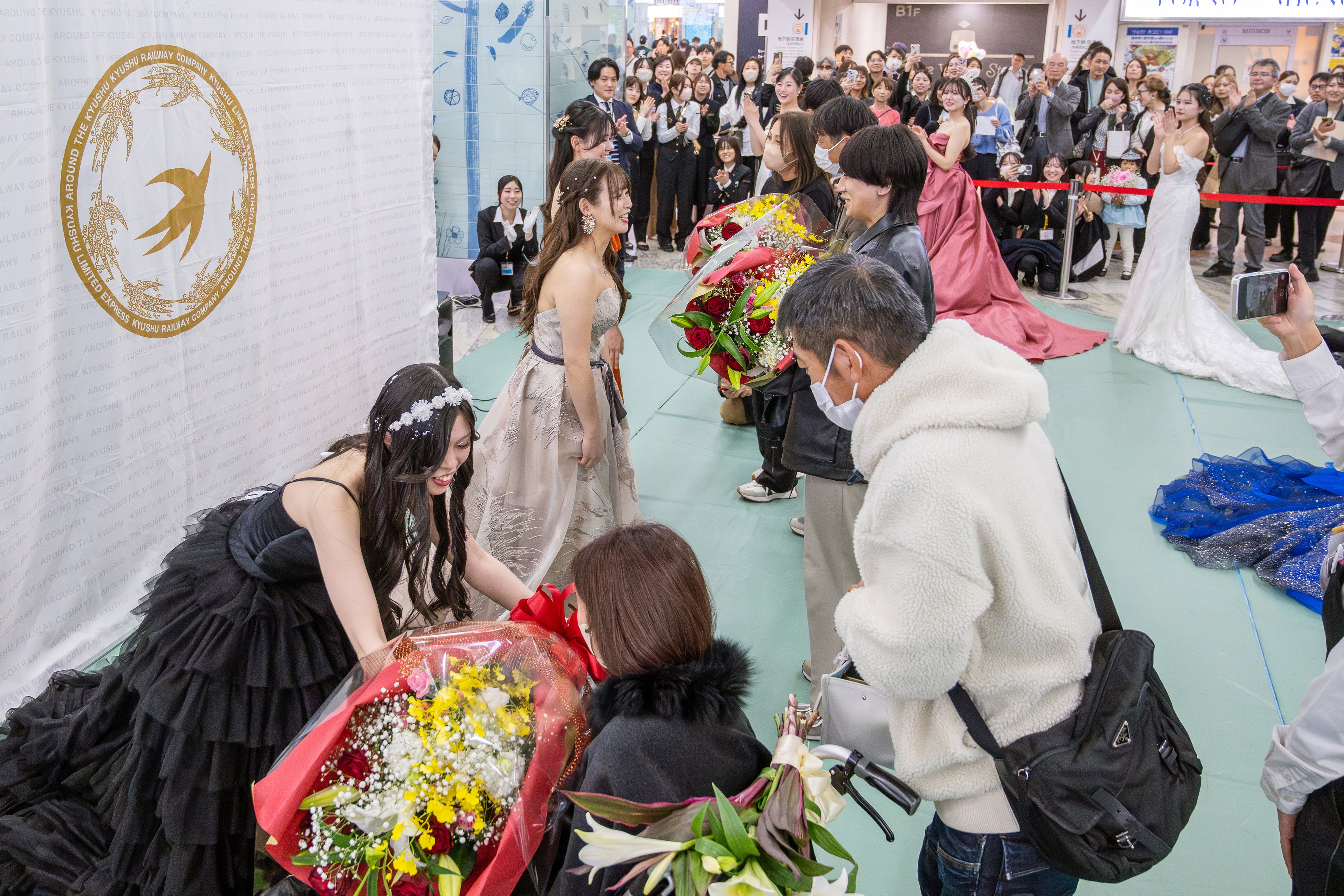 ソニック車内でのウエディングファッションショーが終了した後は、会場を移動し、JR博多駅コンコース内にて再度ショーを開催。イベントを知らない通りすがりの利用客の方も脚を止めて、ショーを観賞する姿もありました。イベントの最後はサプライズということで、ブーケトスも実施され、ショー参加者も体験できる形でイベントが終了しました。