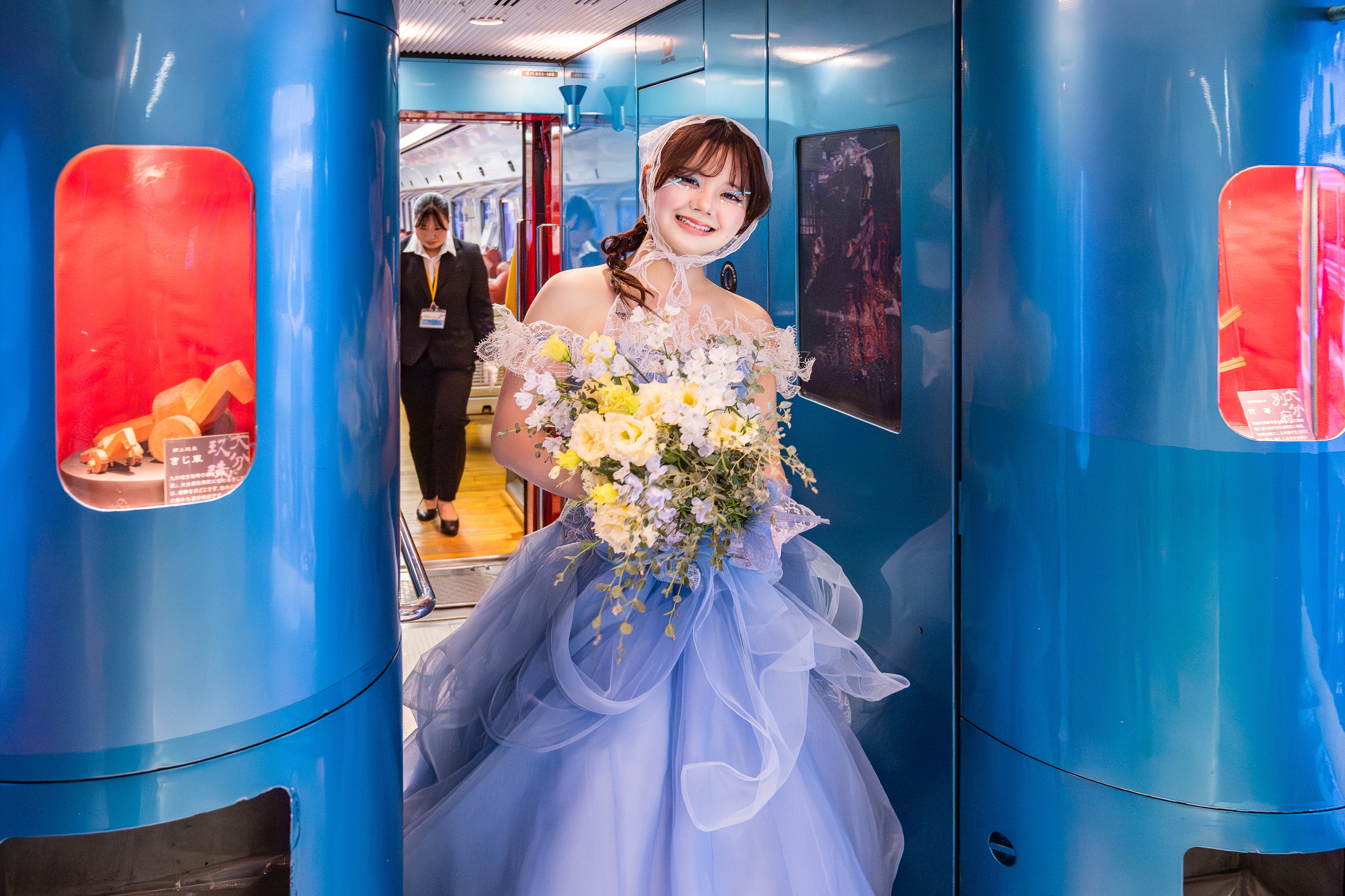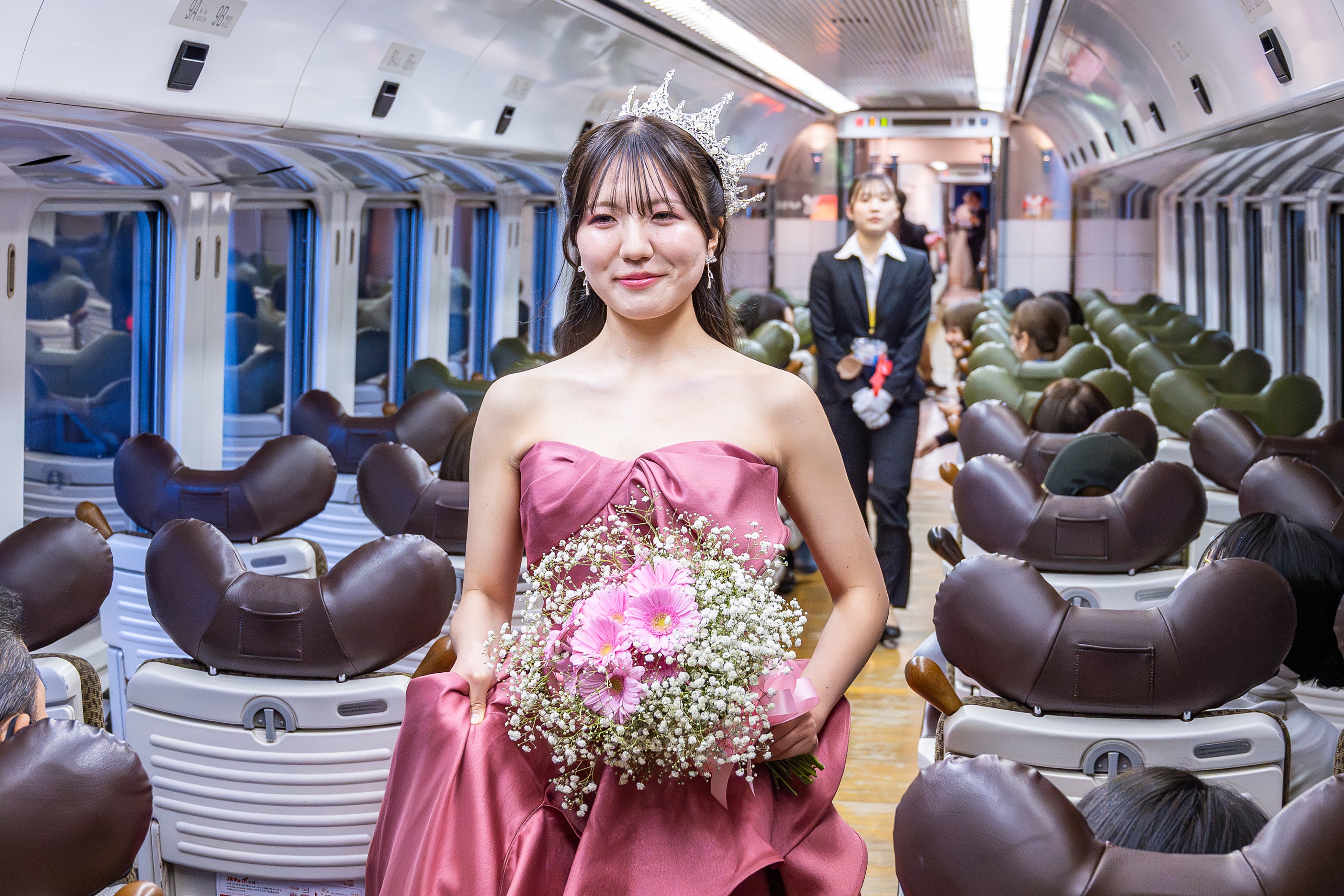 本イベントは、博多~大分間を結ぶ「特急ソニック」運行30周年記念イベントとして行われ、麻生外語観光&ブライダル専門学校の学生が衣装選びから着付け、ヘアメイク、ブーケのデザイン提案などを担当しました。