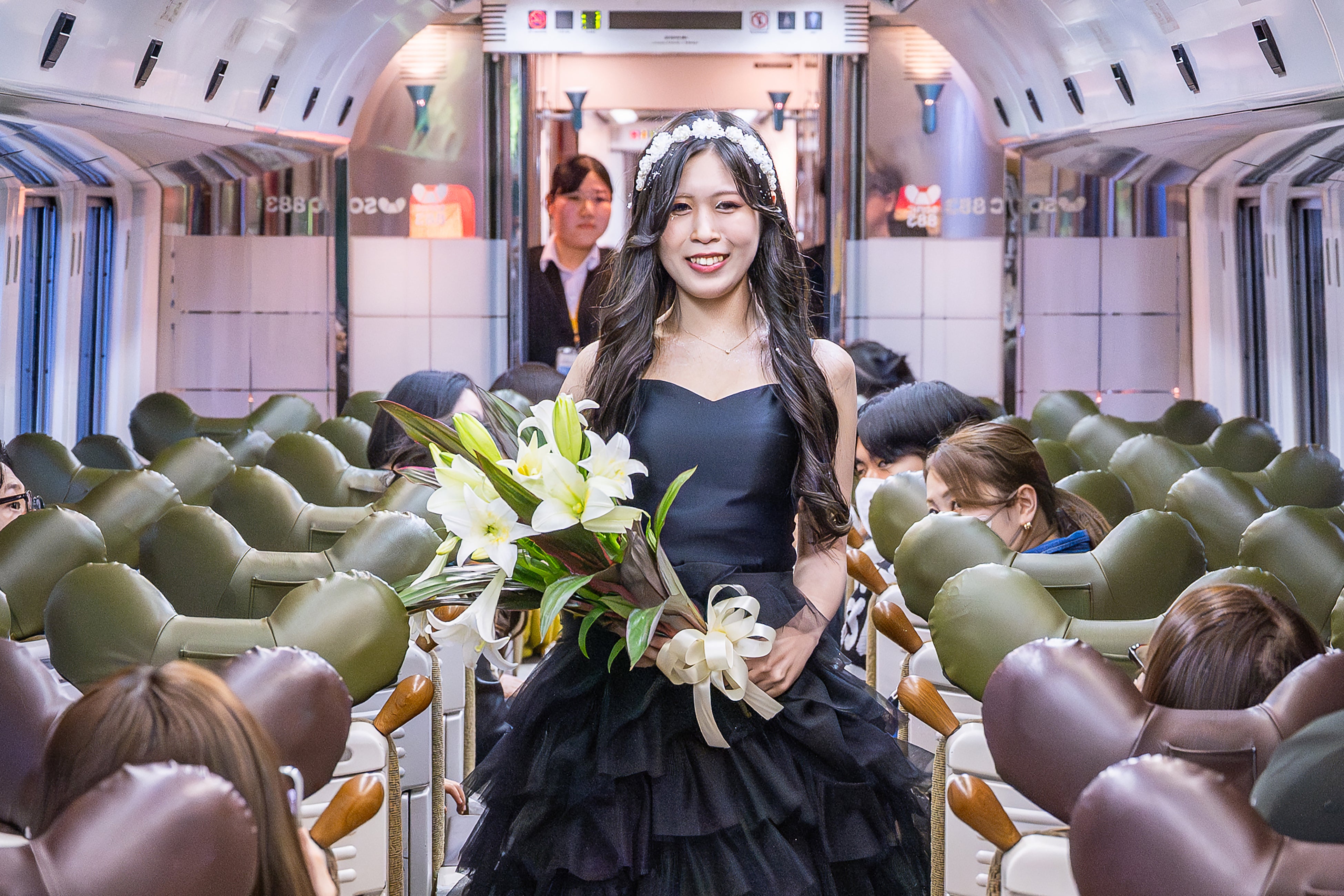 さらに当日は、本校学生がモデルにも挑戦。博多駅駅員の方とあわせた10名が、列車内の通路をランウェイに見立ててドレスを披露し、約200名の観客がソニックの座席から華やかなショーを楽しみました。
