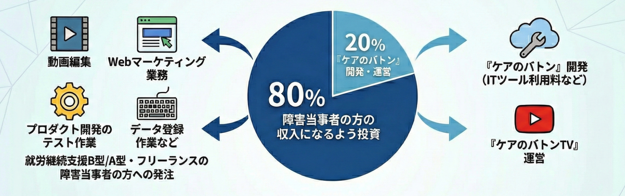 具体的には、就労継続支援B型/A型・フリーランスの障害当事者の方への動画編集・Webマーケティング業務の発注、プロダクト開発のテスト作業、データ登録作業などを想定しています。残りの「20%」はクラウドファンディングのリターン、『ケアのバトン』の開発(各種ITツールの利用料など)やYouTubeチャンネル『ケアのバトンTV』の運営に利用します。