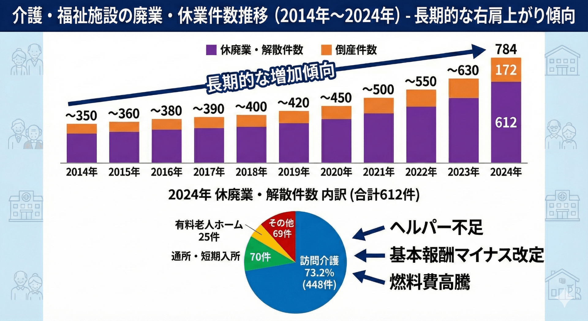 介護福祉業界では、事業所の倒産・休廃業が深刻な社会問題となっています。東京商工リサーチの調査によると、2024年の介護事業者の倒産は過去最多の172件(前年比40.9%増)に達し、休廃業・解散も612件(同20.0%増)と過去最多を記録しました。倒産と休廃業を合わせて784件(同24.0%増)もの事業所が市場から撤退しており、介護保険制度が始まった2000年以降で最悪の状況です。