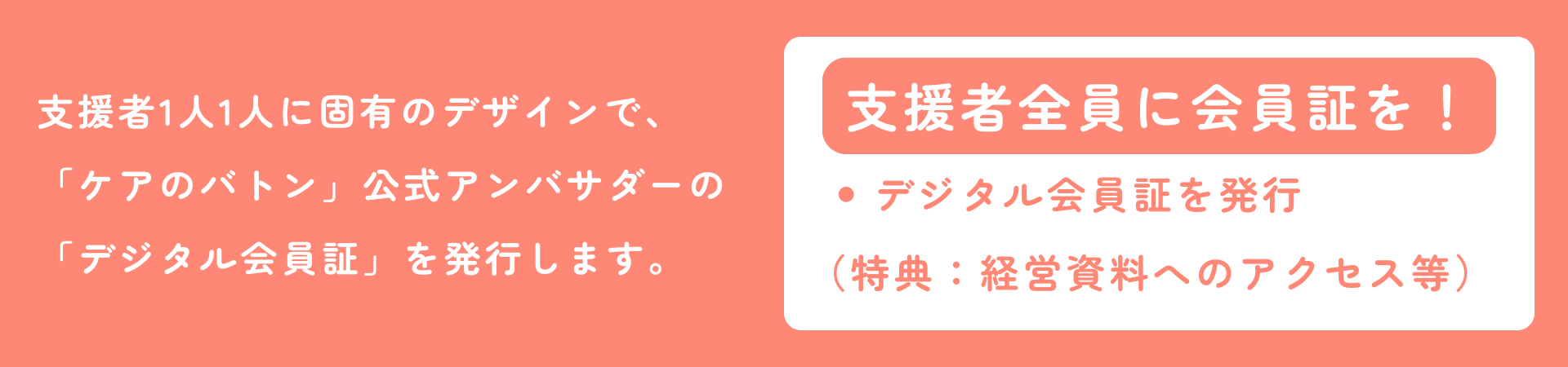 今回のクラウドファンディングでは「参加型・体験型」の様々なリターンをご用意しております。ご支援いただいた方、1人1人に固有のデザインで、ケアのバトン公式アンバサダーの「デジタル会員証」を発行します。今後、「デジタル会員証」の保有者限定イベントへの招待や資料へのアクセス等の特典を提供予定です。