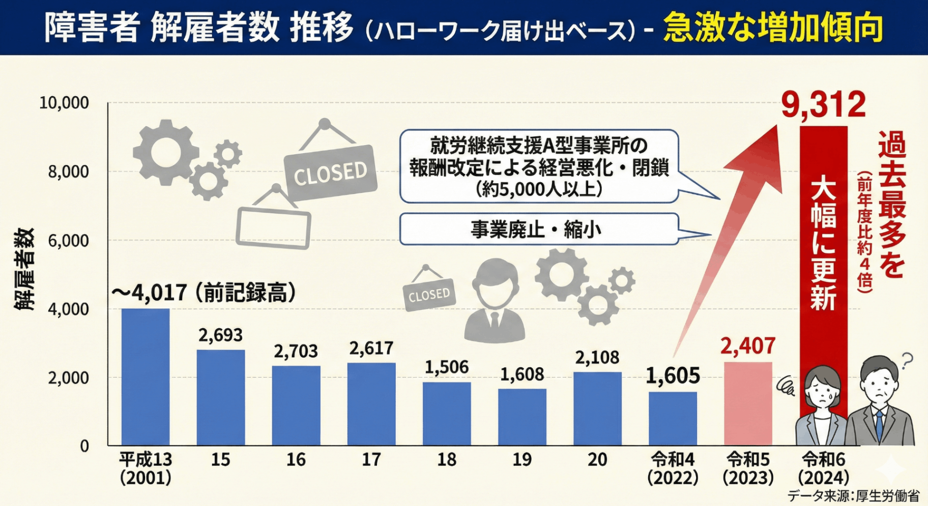 また、就労継続支援A型事業所の廃業も顕著で、障害者雇用における解雇件数も過去最高を記録しました。2024年3月~7月の5ヶ月間で全国329カ所の就労継続支援A型事業所が閉鎖され、少なくとも約5,000人の障害のある方が退職になったと言われています。