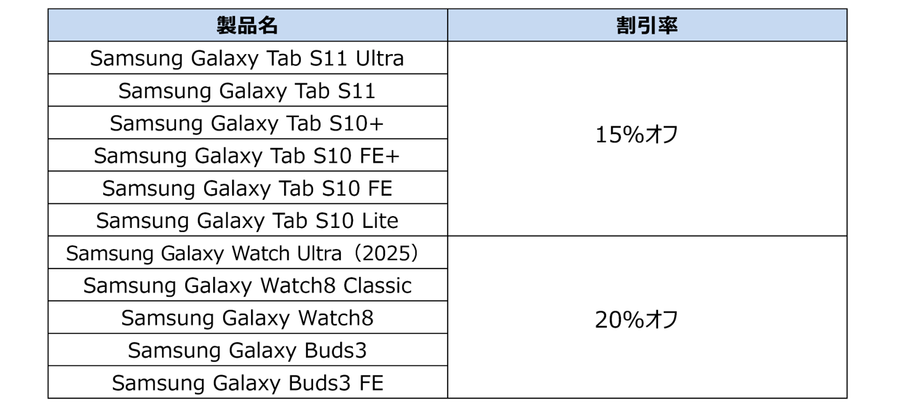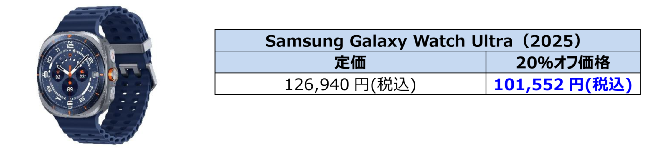 キャンペーン期間中はGalaxy AI機能と進化したSamsung DeX体験、薄型・軽量で且つ高い生産性を実現する最新のAIタブレット「Samsung Galaxy Tab S11シリーズ」や、健康と睡眠をコーチングしてくれる最新AIスマートウォッチ「Samsung Galaxy Watch8│Watch8 Classic」、「Samsung Galaxy Watch Ultra(2025)」などが最大20%オフの価格でご購入いただけます。