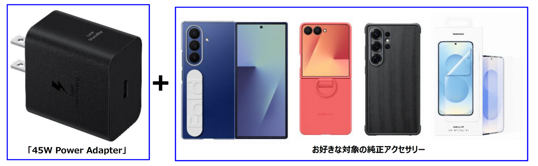 キャンペーン期間中に対象のスマートフォン製品をご購入いただくと、「45W Power Adapter」と選べる対象の純正アクセサリーをプレゼントいたします。