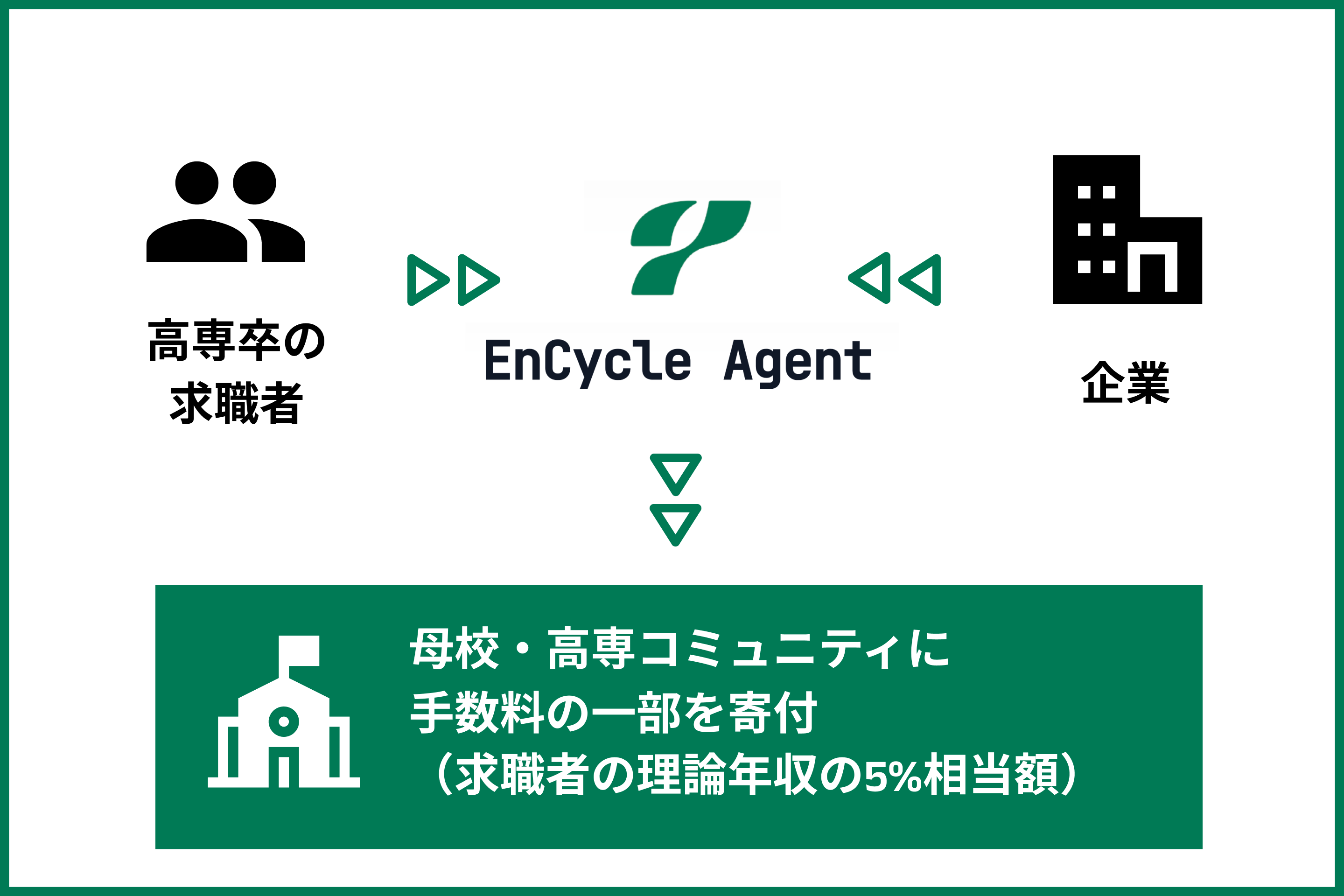 求職者がEnCycle Agentを通じて希望する企業への入社が決定した場合、その方の理論年収の5%相当額を当社が負担し、出身高専もしくは高専コミュニティへ寄付します。