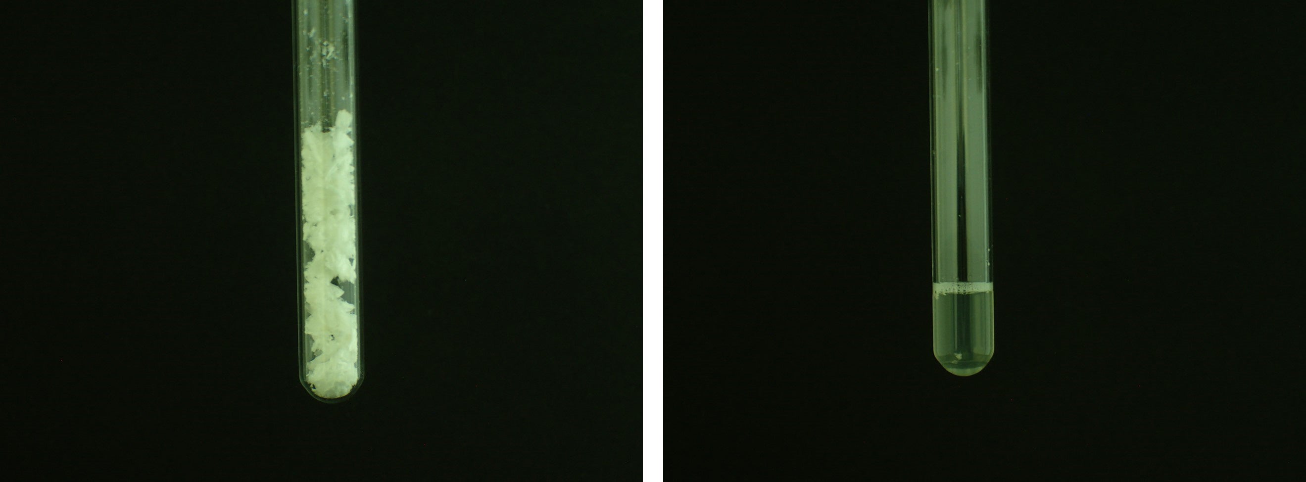 左:溶解前のシルクパウダー 右:水に溶けたシルクパウダー