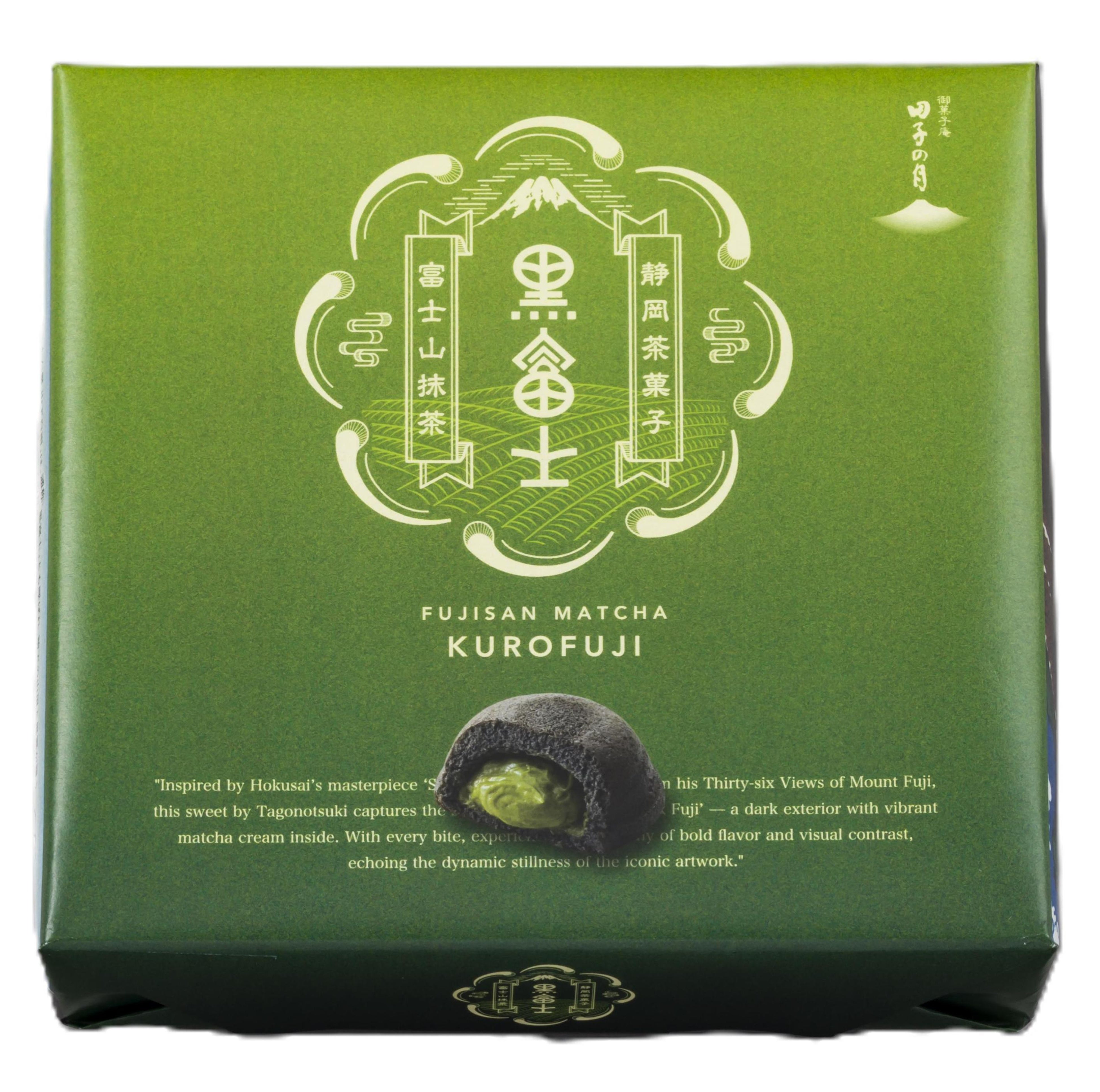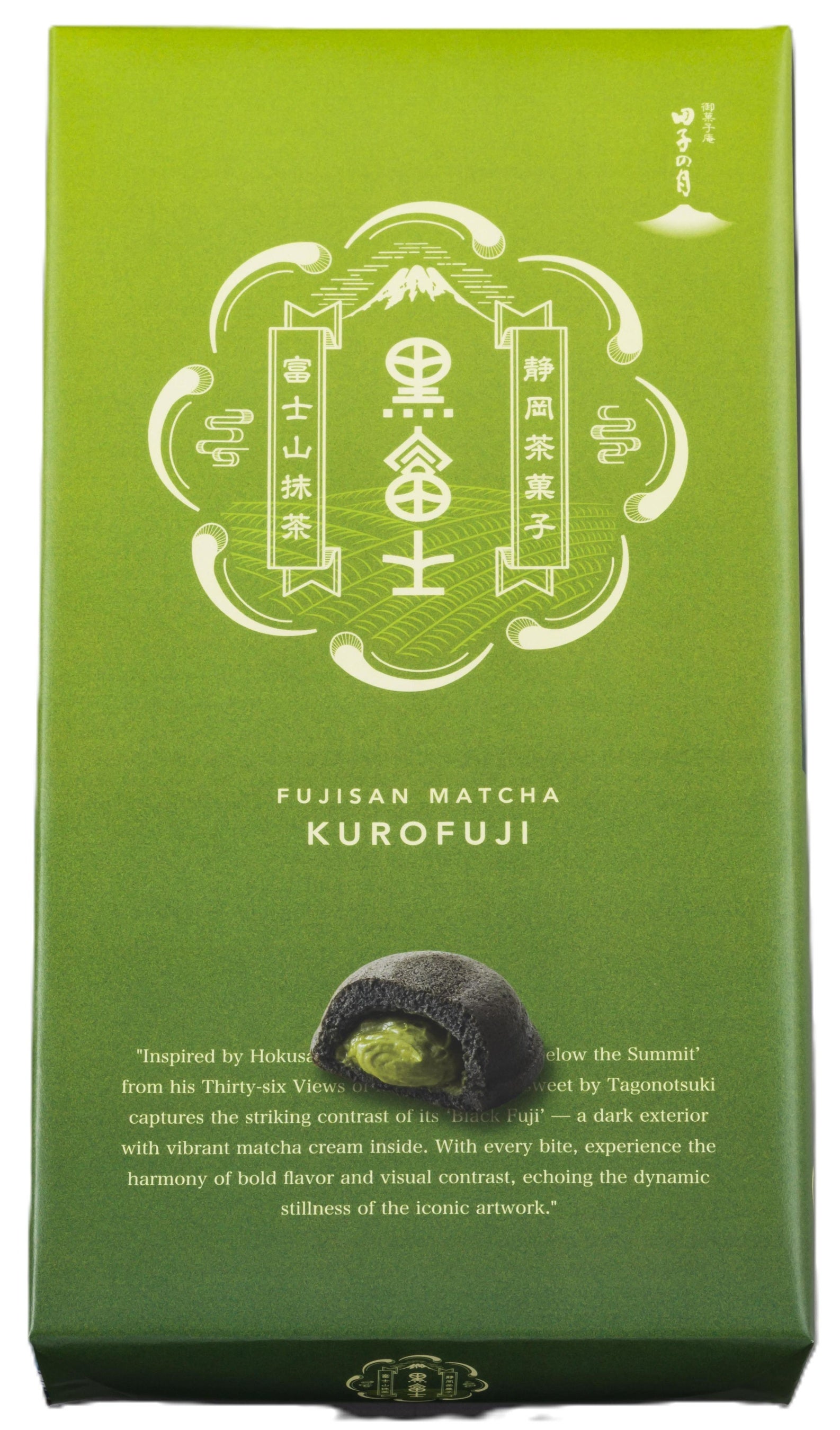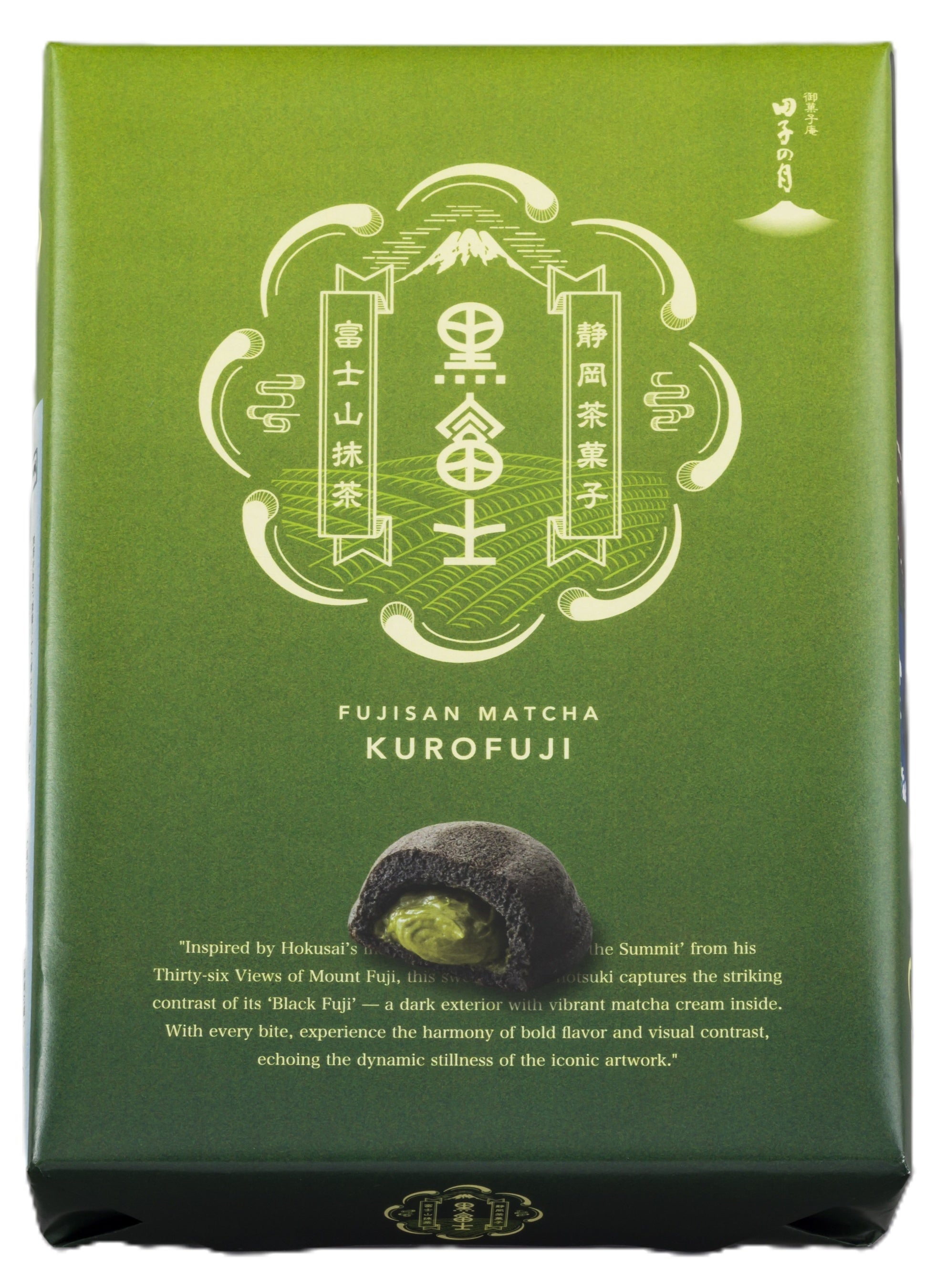 「黒富士」は浮世絵師・葛飾北斎の作品「富嶽三十六景 山下白雨」、通称「黒富士」からインスパイアされ誕生しました。中にたっぷりと詰められた濃厚な抹茶クリームには、富士市で育てられたオーガニック抹茶を贅沢に使用。皮には富士宮で採れたお茶を炭にしたお茶炭を使い、黒と緑の美しいコントラストもお楽しみいただける商品に仕上がりました。漆黒のエッジの効いた見た目とは裏腹に、繊細な抹茶の風味を感じる一品です。