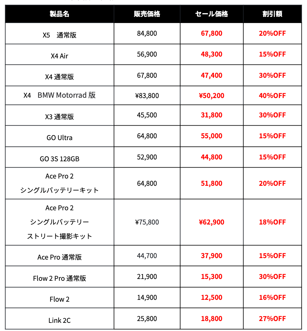 本セールでは、最新の360度全景カメラ「X5」や大人気のポケットサイズの4Kアクションカメラ「GO Ultra」、8Kアクションカメラ「Ace Pro 2」をはじめとした製品を、特別価格でご提供いたします。