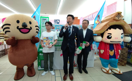 アオキスーパー清城店:半田市長・だし丸くん(半田市観光マスコットキャラクター)