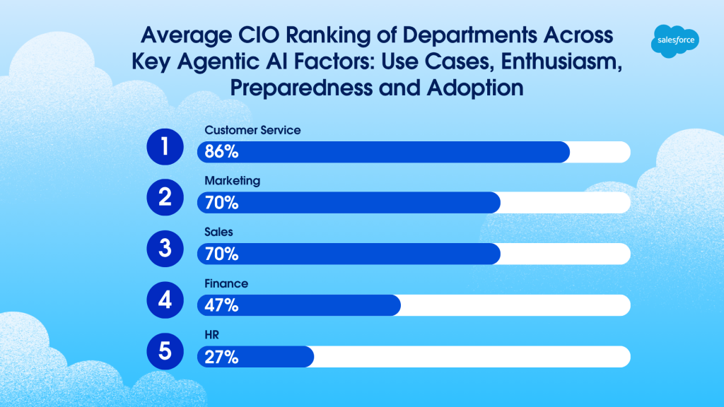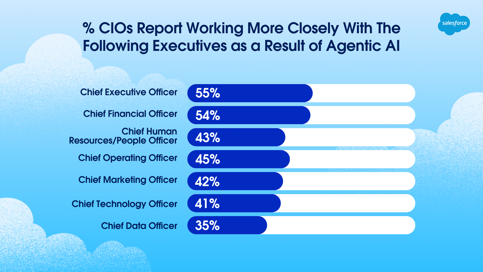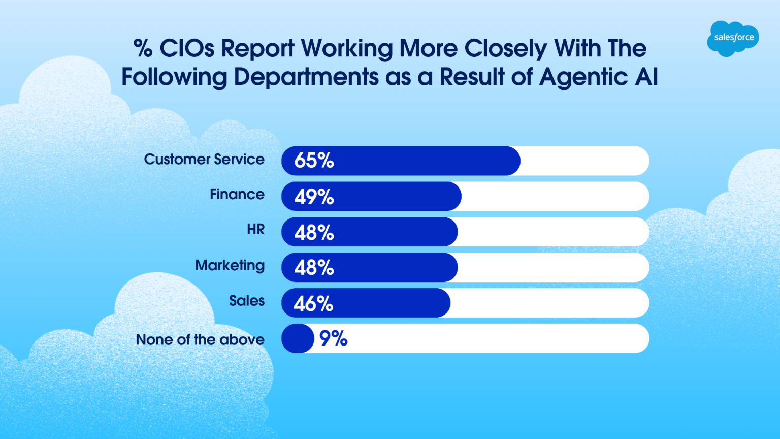 - CIOの65%が、自律型AIの導入により顧客サービス部門とこれまで以上に緊密に連携していると回答しており、これは他のどの部門よりも高い割合です。