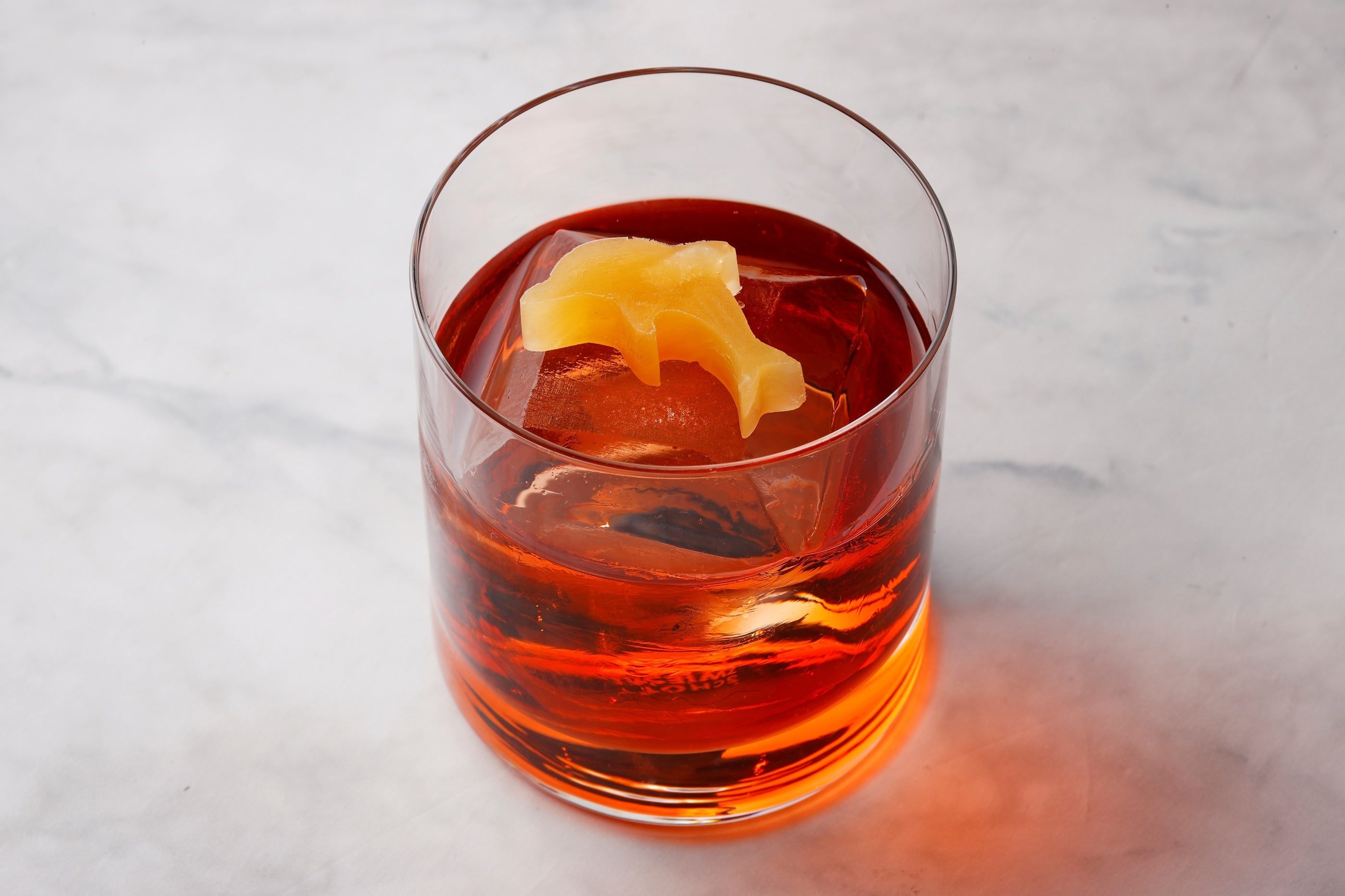 世界的に人気を集めるネグローニを、トロピカルのニュアンスで再解釈。イルカをかたどったマンゴーの果実をあしらい、クラシックに遊び心を添えたモダンな表情に仕立てています。