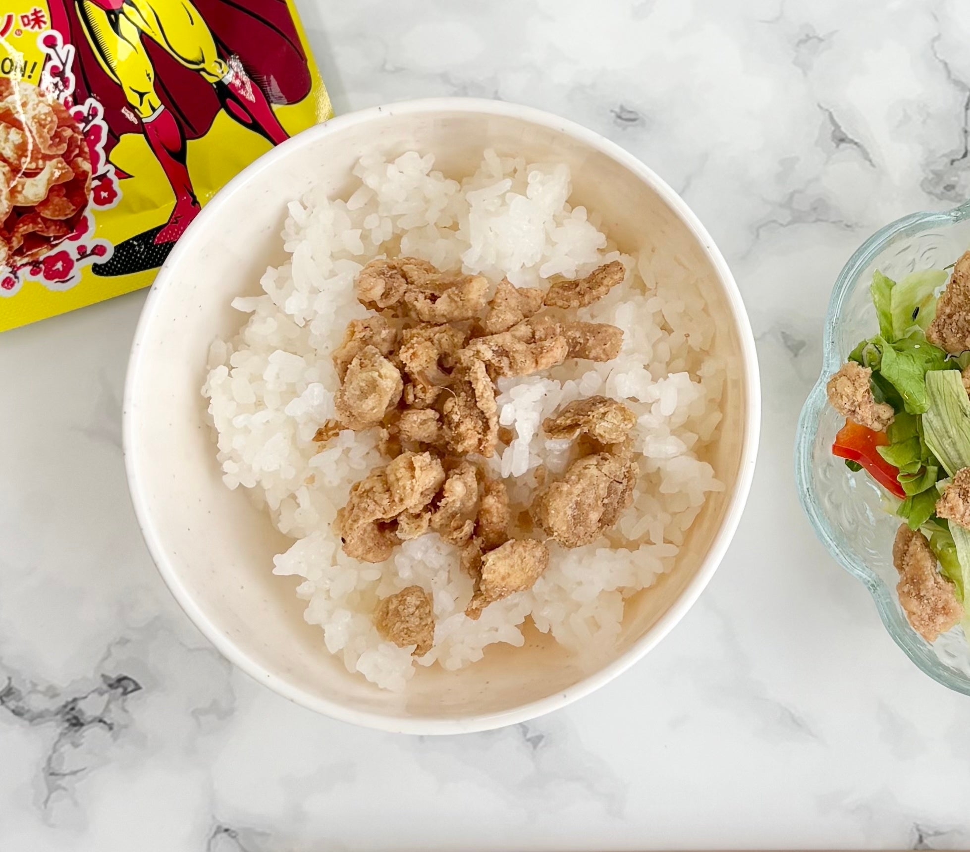 お好みの大きさに砕いてあつあつの白米の上に掛けて食べてみたら、お米のふわふわ感に鶏皮のカリカリ食感が合わさって食感も楽しめて食べ応えがあります。また、ほんのりと梅が感じられるので、ご飯も進みます。ふりかけのような感じで手軽に味変できるのでオススメです!