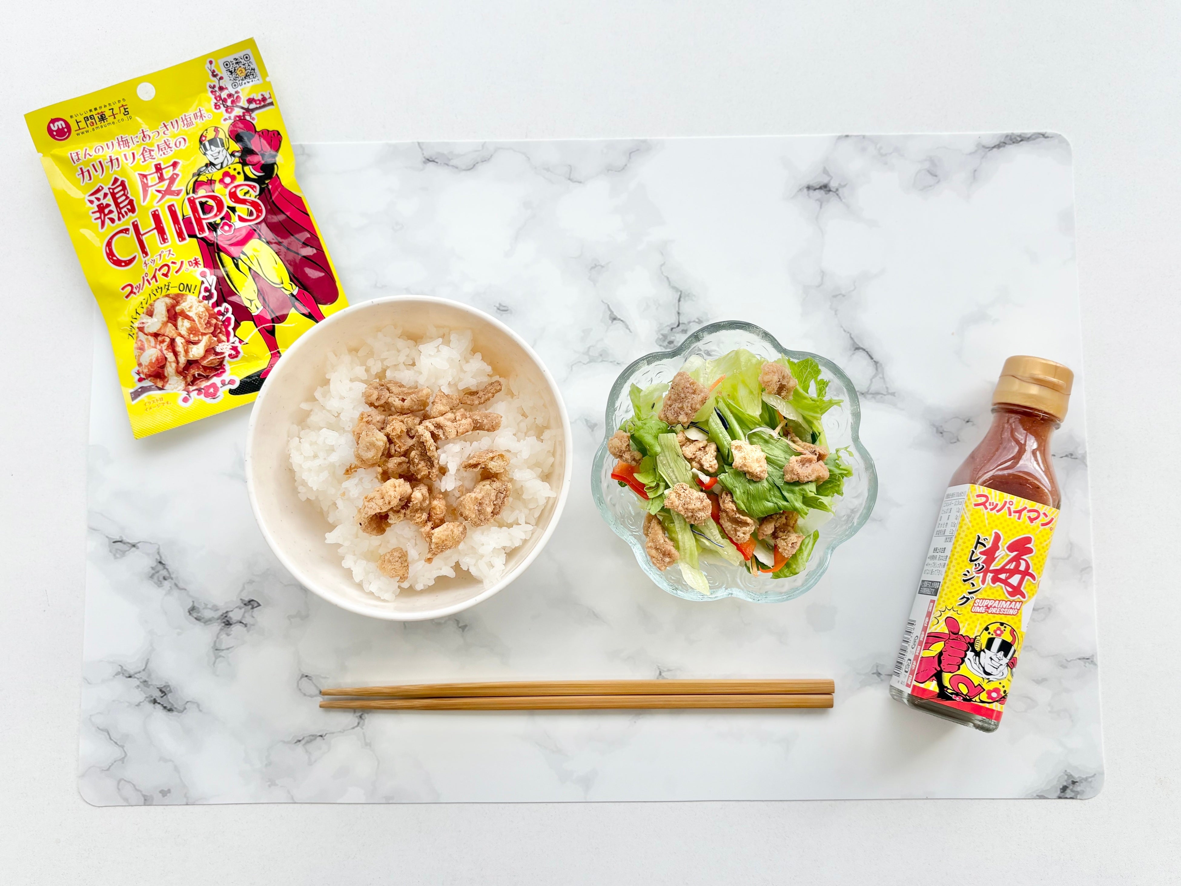いつものサラダにクルトン感覚で鶏皮CHIPSをかけてみたところ...鶏皮のサクサク感と口の中にほわっと広がる梅の酸味が美味しくて、良い食べ方を発見したと思いました。