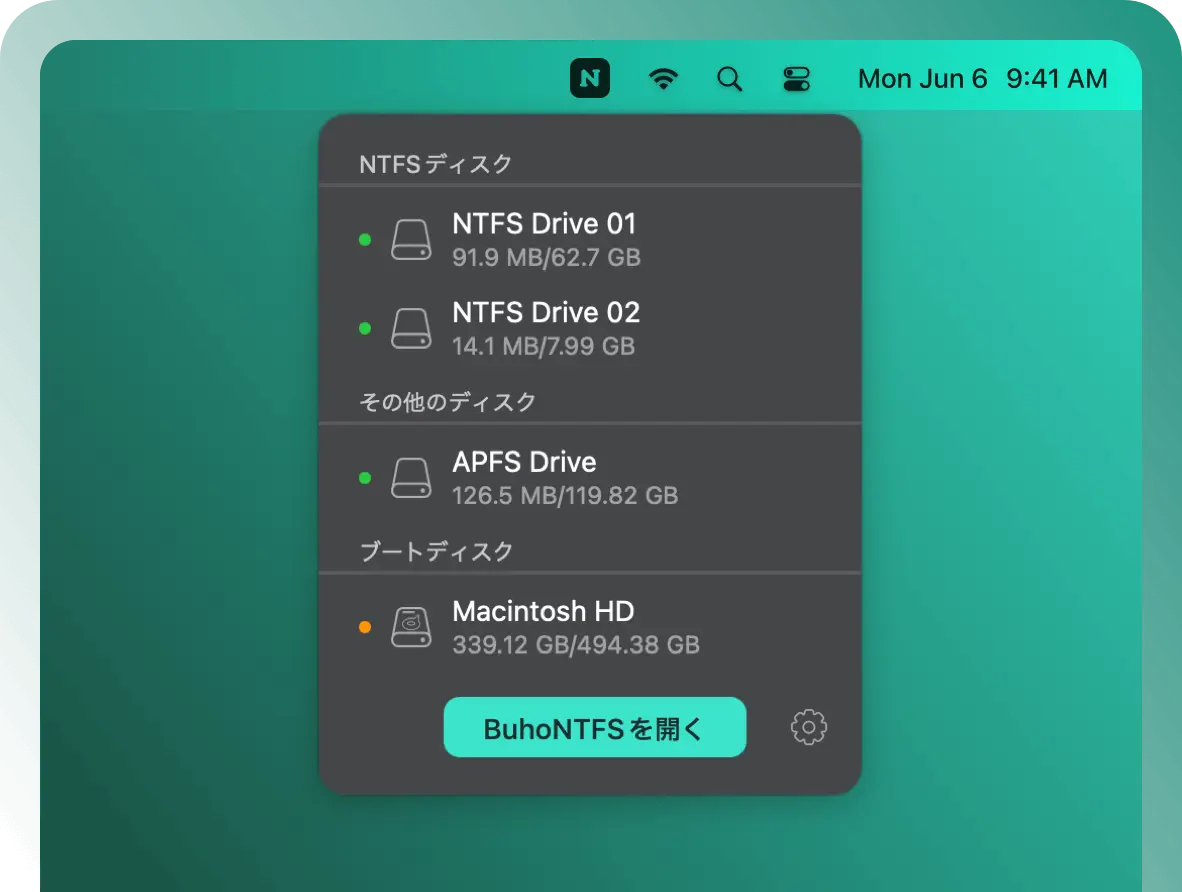 日常的なNTFS簡単などの操作がシームレスに行えるように、BuhoNTFSメニューを設計しました。この機能により、Macのメニューバーでは、マウントされたNTFSドライバを直感的に、かつ効率的に管理でき、使い勝手も大幅に向上させます。