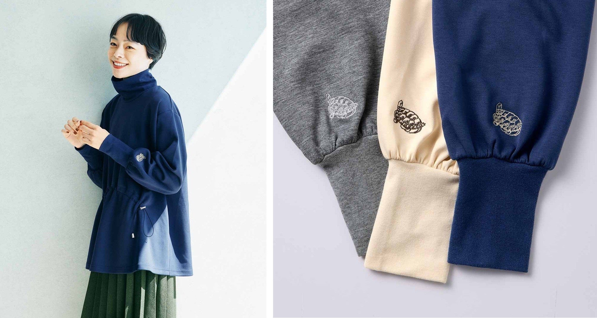 ◆亀のロゴ刺しゅうが愛らしい、“きれい見え”タートルネック
