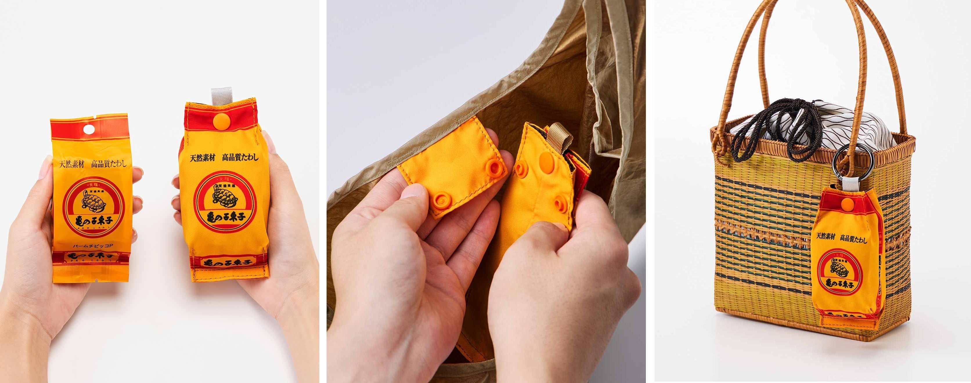 「誰かのために」という思いを大切にしながら、現代の生活に合うデザインで商品ラインナップを展開。亀の子束子のパッケージを再現したポーチが付いたエコバッグ、「亀の子スポンジ」とおそろいの水ぬれ防止のアームカバー、ふだん使いしやすいタートルネックトップス、ミニ束子と亀チャーム付きの気軽にものを持ち運べるショルダーマイポッケなど、家族やママをさりげなく助けるアイテムをそろえました。