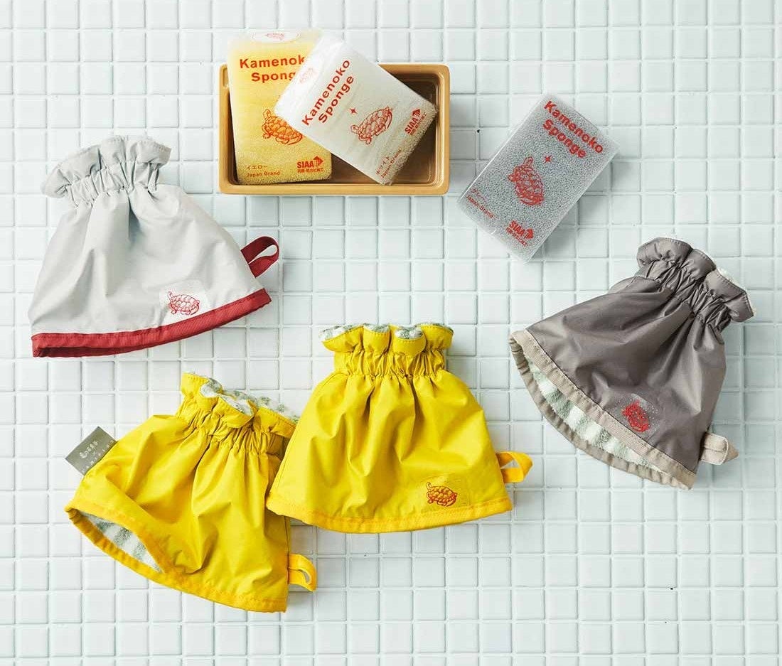 腕まくりした袖がずり落ちないよう、ゴム仕様でフィット感も抜群。さらに、使用後はサッとつるして乾かせる便利なループ付き。亀の子スポンジの定番色からインスピレーションを得たこだわりのカラー展開で、泡をイメージしたラメ入り透明タグには亀のロゴを添えました。毎日の水まわり時間が、ごきげんになること間違いなしです。