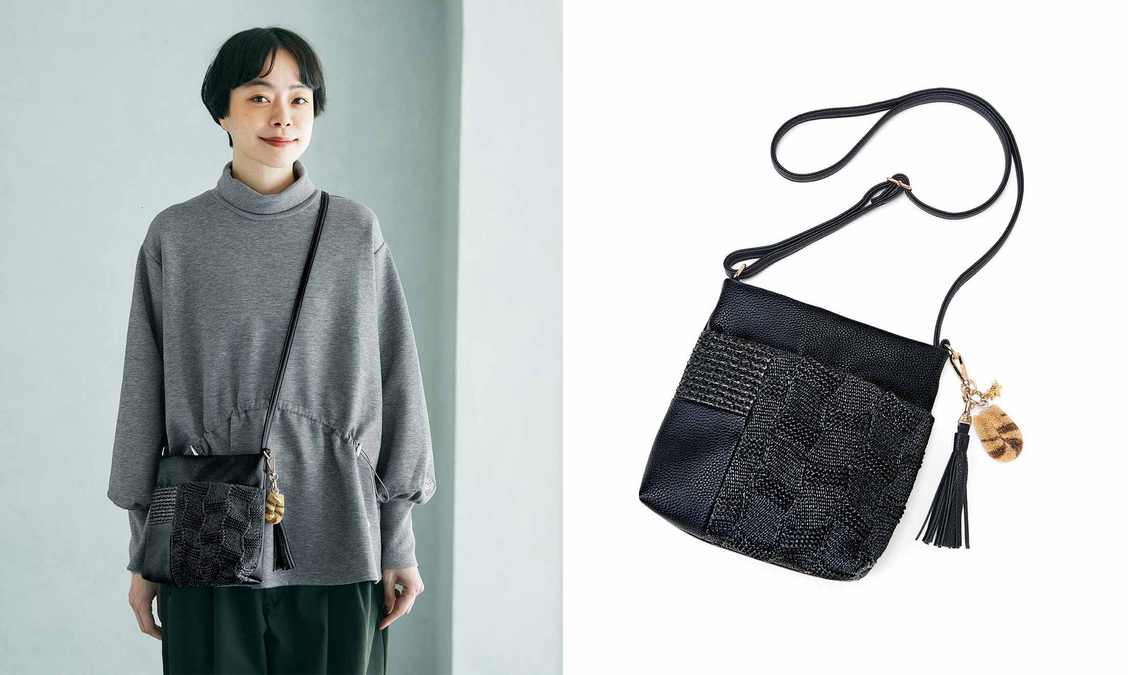 ポケット感覚で身軽にものを持ち運べる「マイポッケ」に、亀の子束子とのコラボデザインが登場!雑材風の編み地と上品な合皮を組み合わせた大人仕様で、サイドにはタッセルとともにミニ束子&亀チャームがゆらり。ミニ束子は爪のお手入れにも使える実用派です。