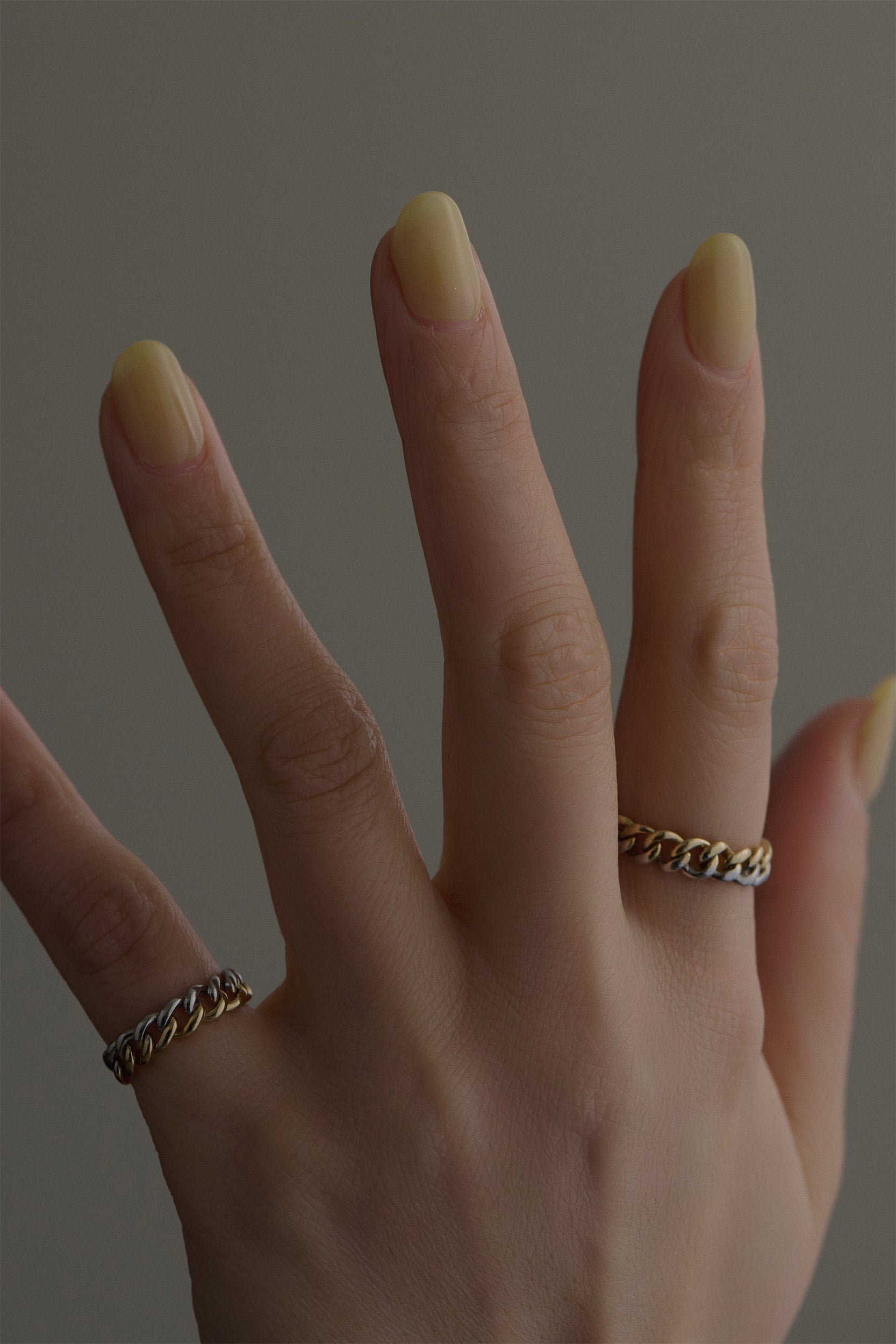 18Kイエローゴールドとプラチナを組み合わせた〈Dual Tone Ring〉は、ゴールドとプラチナのコマを組み替えながら編み上げることで生まれる二色のコントラストが特徴で、制作には数十時間を要する、〈kiuna〉のクラフトマンシップを象徴する一本です。
