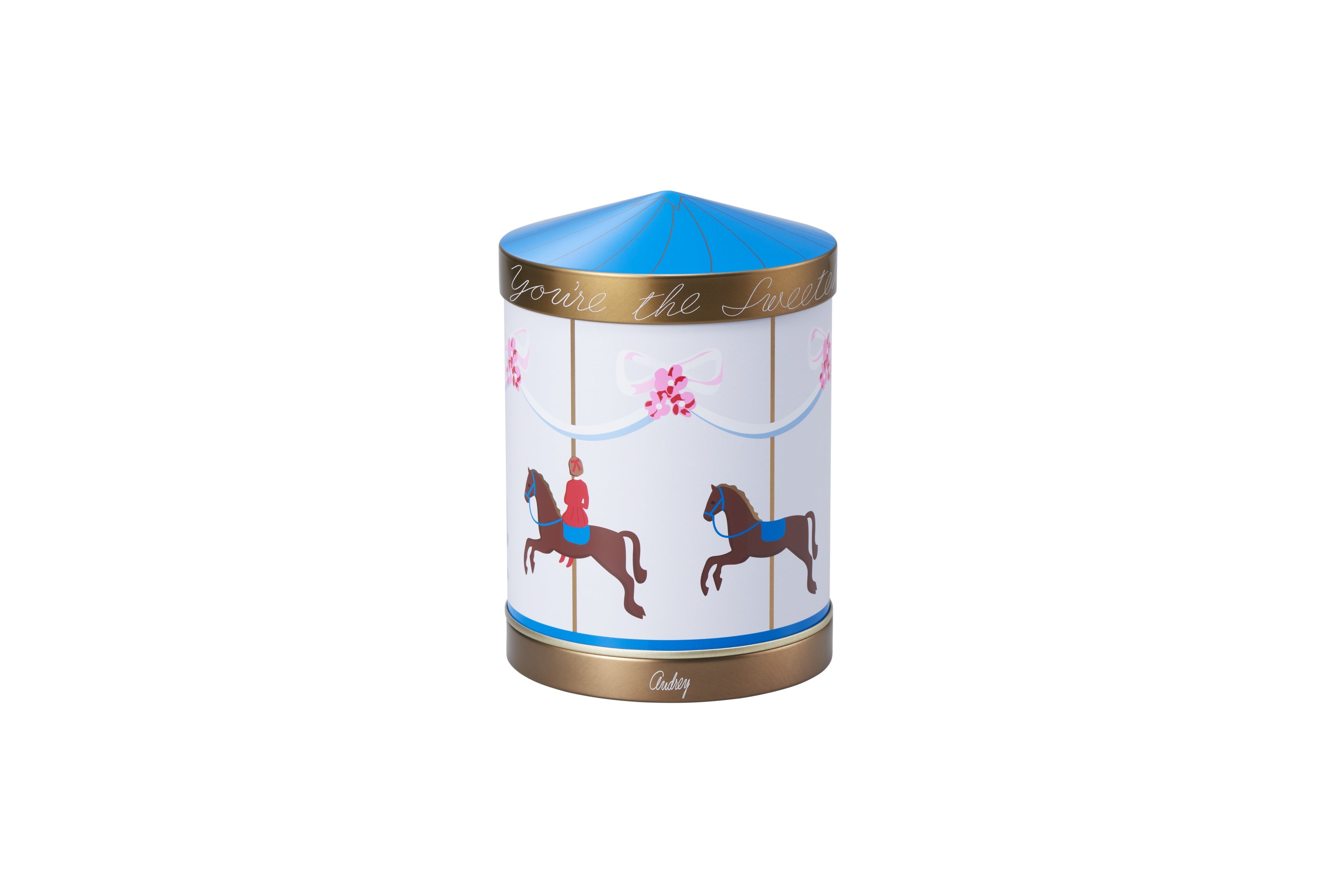 メリーゴーランドに乗ったオードリーとオオカミのレオがデザインされた、グレイシア(ミルク)7個入りのオルゴール缶。缶の底を回すと、ゆっくり回転しながら優しいオルゴールの音色が流れます。お菓子を食べ終わった後にも、インテリアとして飾っていただけます。