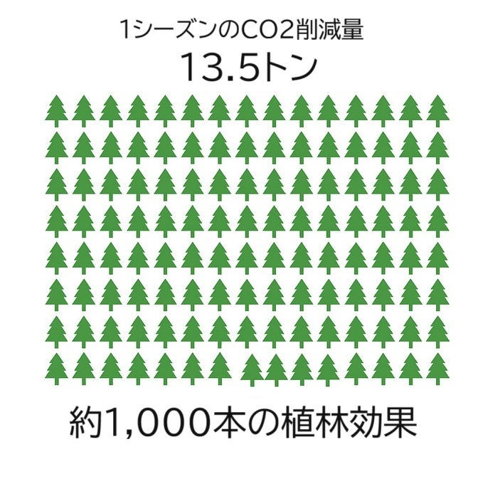 1シーズンのCO2削減量13.5トンとなり、これは、成木およそ1,000本が1年間かけて吸収する
