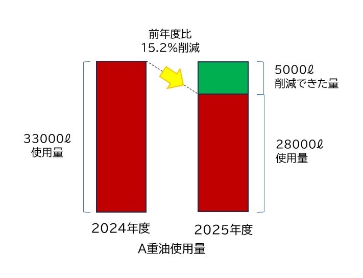 33,000リットルを28,000リットルに「15.2%」削減、燃料コスト削減及びCO2排出量「13.5トン」の削減をすることに成功しました。