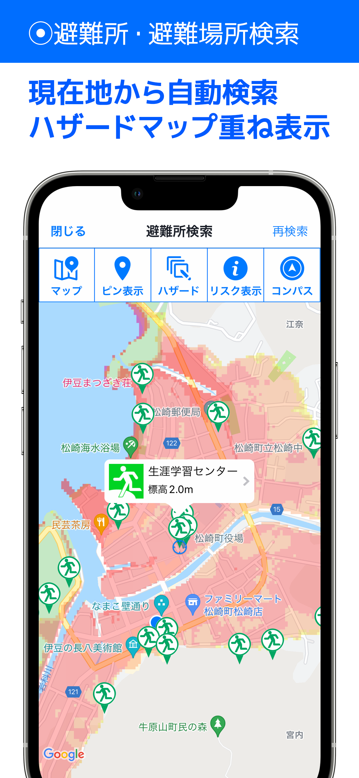 ・避難所・避難場所を、現在地から近い順にリスト表示します。
